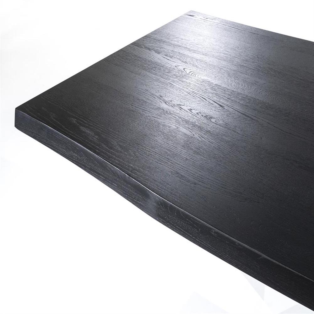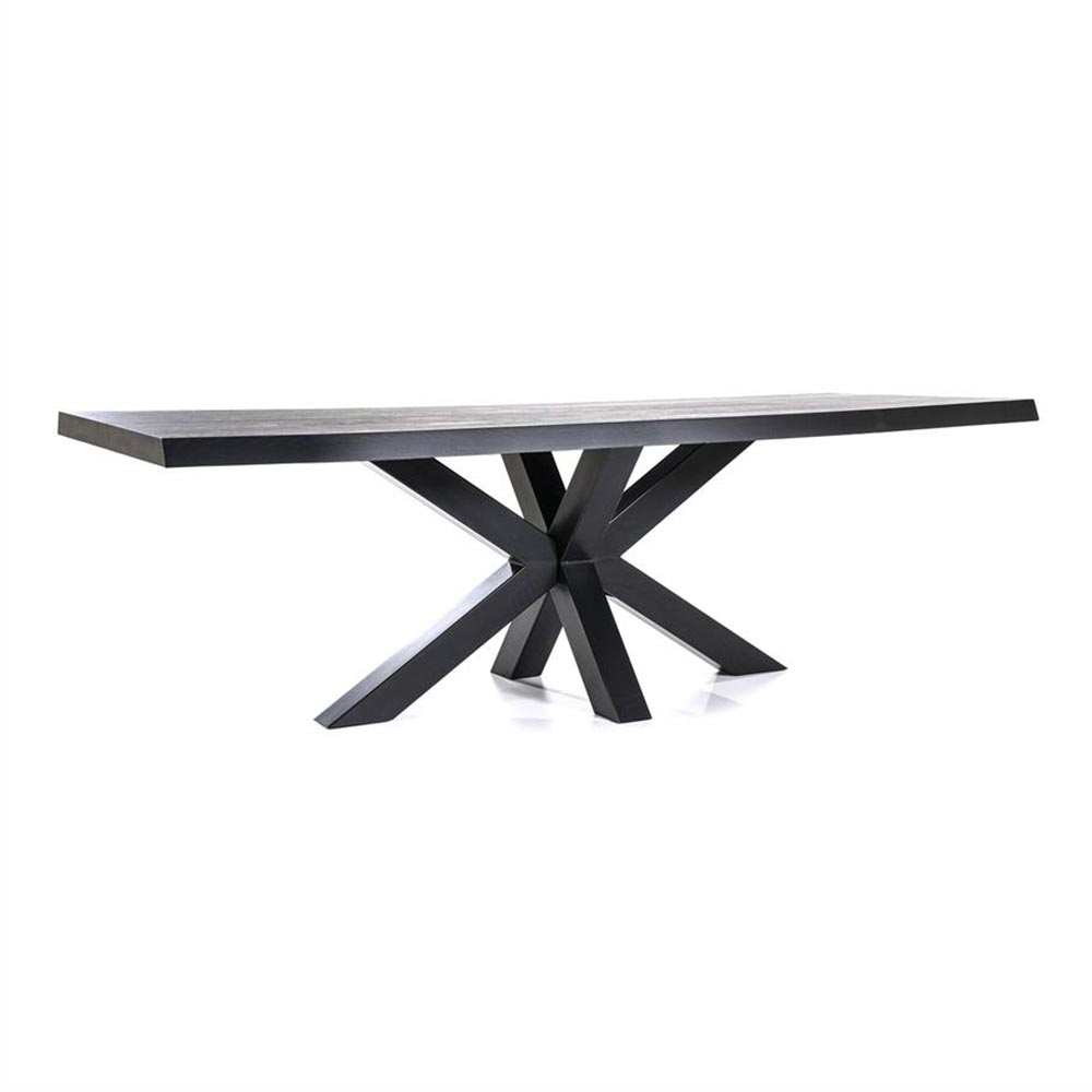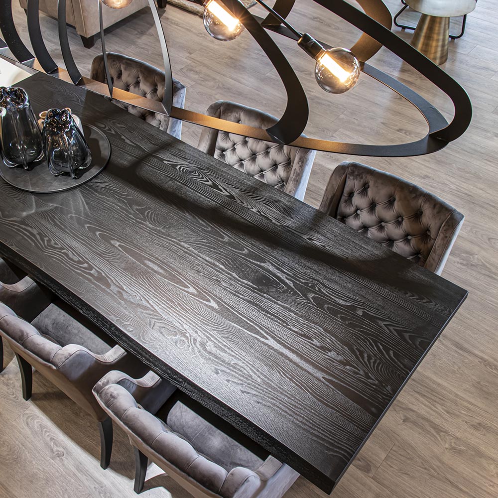 De trend van de boomstamtafel zien we al enige tijd. Maar nu is er een nieuwe variant, namelijk de zwarte boomstamtafel. De tafel bestaat uit een robuust eiken houten blad met een afmeting van 240×100 cm. Het blad is 6 cm dik voor een extra grove look. Dit maakt de tafel dan ook prima geschikt voor diverse woonstijlen als luxe, landelijk of industrieel. De metalen spinpoot maakt de eettafel helemaal af. Ook deze is in het zwart uitgevoerd. De rechthoekige boomstamtafel zwart biedt genoeg ruimte voor 6 stoelen.