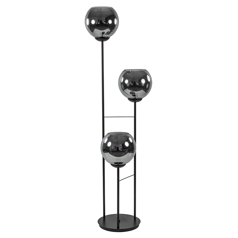 Deze prachtige vloerlamp maakt het interieur helemaal compleet. De stijlvolle vloerlamp heeft een mat zwart armatuur met drie stangen die in verschillende hoogtes zijn verdeeld. Dit geeft de staande lamp een elegante verdeling. Ieder lichtpunt is voorzien van een smoke/titanium glazen bol die wordt ondersteund door een brede fitting. De glazen bollen zijn ambachtelijk geproduceerd en hebben aan de bovenzijde een opening zodat u gemakkelijk de lichtbron kunt plaatsen. Het titanium glas geeft de lamp een chique luxe uitstraling die mooi is te combineren in diverse woonstijlen. De vloerlamp met glazen bollen heeft een zwart snoer van 330 cm met een vloerschakelaar op 195 cm van de lamp en wordt exclusief lichtbron geleverd (3x E27).