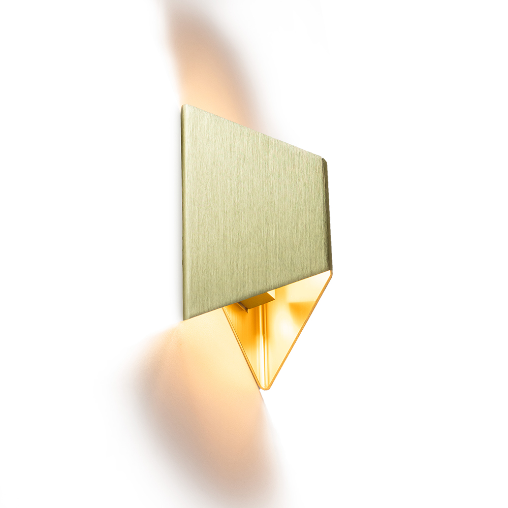 Een stijlvol strak wandlampje perfect voor in de hal of naast het bed. De lamp heeft de vorm van een prisma en is gemaakt van goud kleurig metaal. Door de gleufjes aan de boven en onder zijde is er een speels, maar strak effect gecreëerd wat perfect past in een moderne woonstijl.