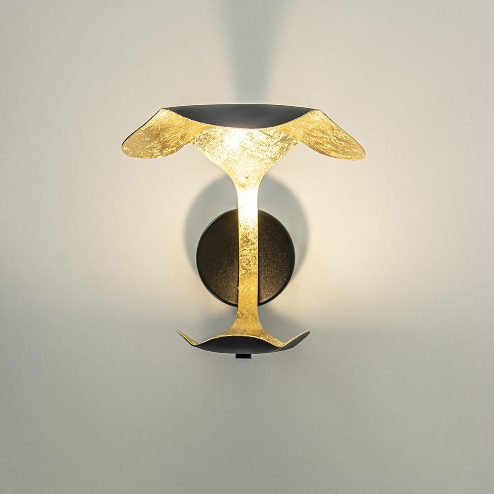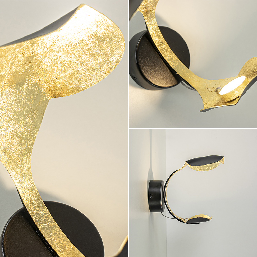 Fijne sfeervlichting voor in een hal, woonkamer of slaapkamer. Deze design wandlamp is een verrijking voor het interieur. De wandlamp is voorzien van LED verlichting en volledig gemaakt van metaal. Dit is afgewerkt met een zwarte en goldleaf finish wat de lamp een chique en luxe uitstraling geeft. De LED wandlamp zorgt voor fijne indirecte verlichting en daardoor voor een speels schouwspel in de ruimte. De design wandlamp is niet voorzien van een snoer en dient dan ook direct op een stroompunt te worden geplaatst. De goldleaf wandlamp is dimbaar middels een externe dimmer (exclusief).