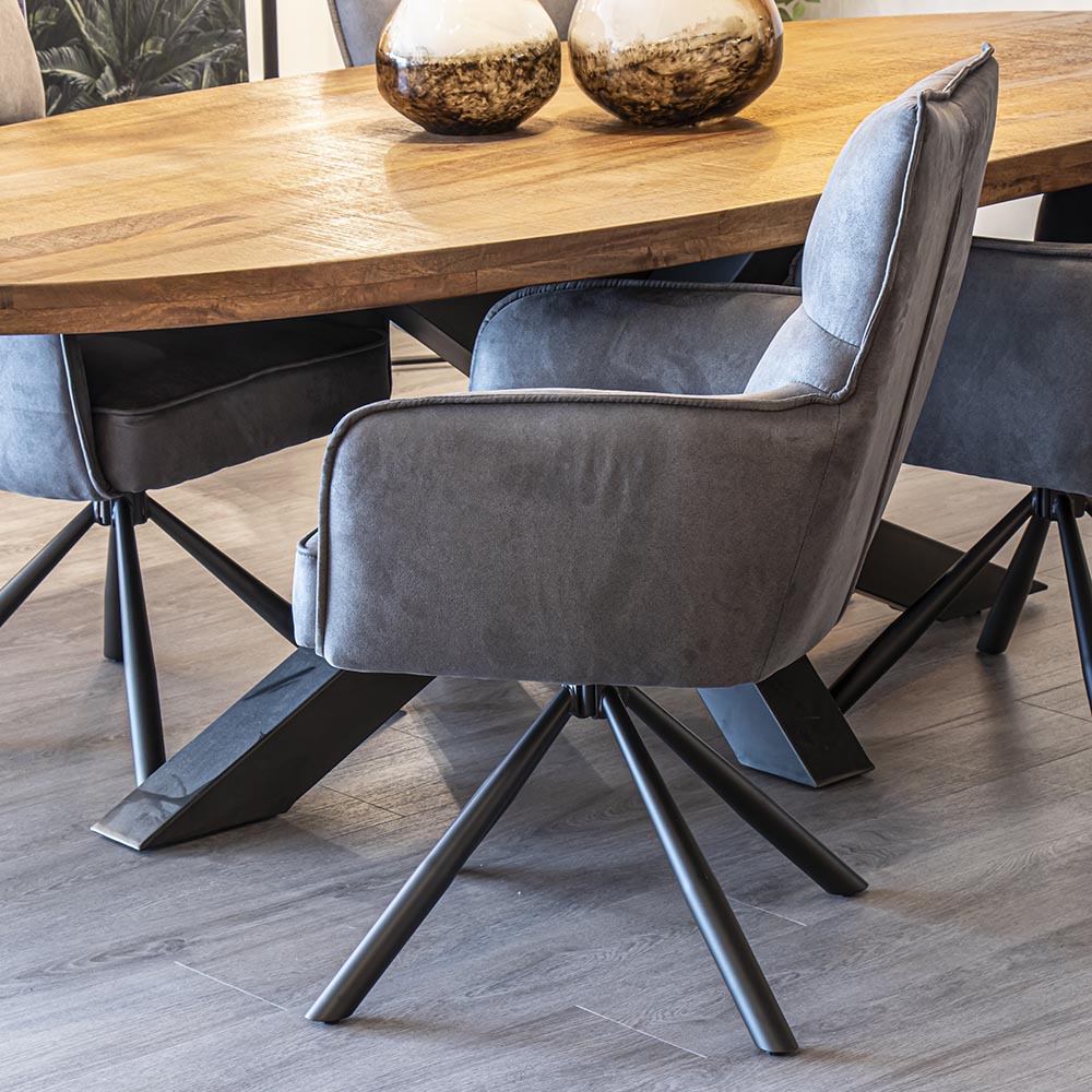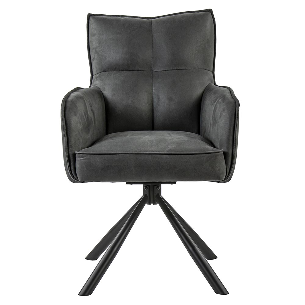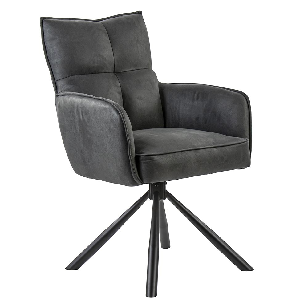 Deze stijlvolle eetkamerstoel zorgt voor een fijn comfort tijdens het dineren. De stoel is 180° draaibaar en is voorzien van een return-system. De armstoel heeft een stoffen zitting die is uitgevoerd in het antraciet. Dit is verder mooi gecombineerd met chique zwarte poten.