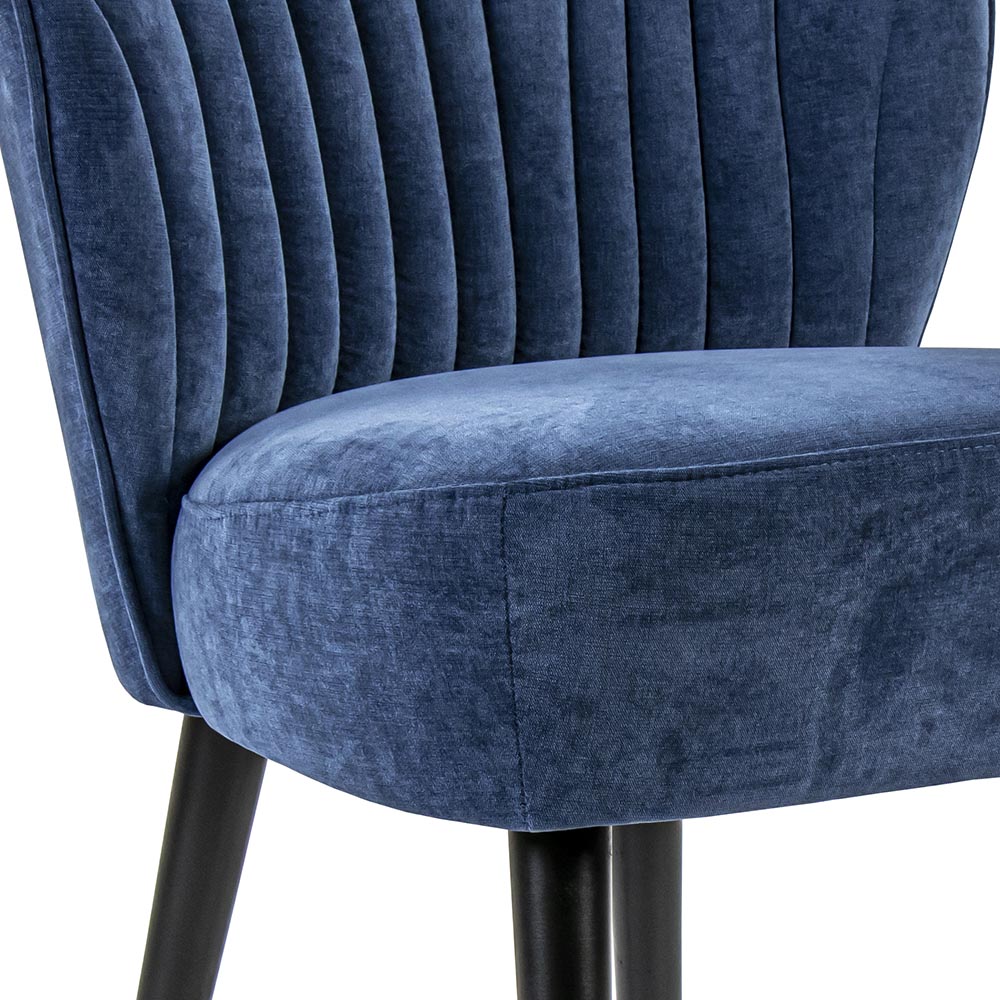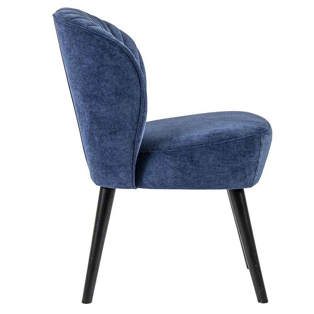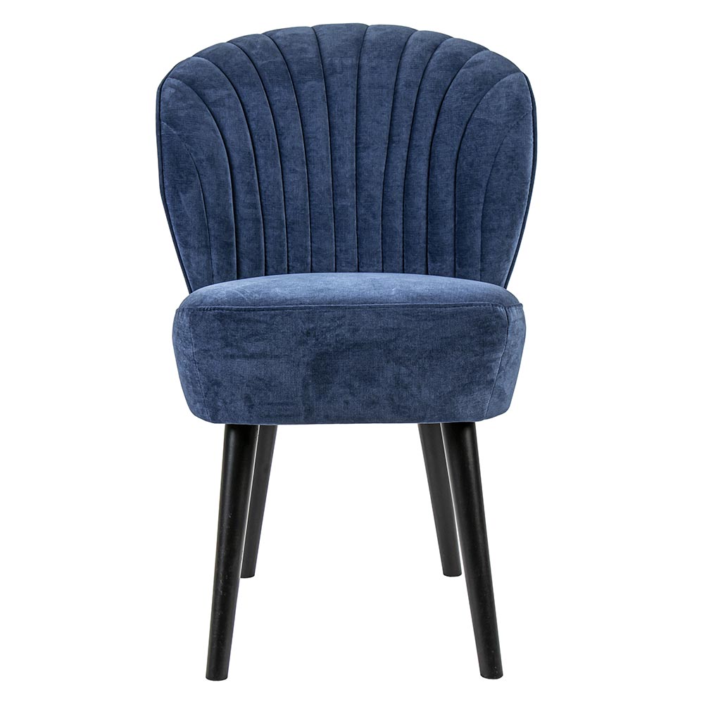 Een trendy eetkamerstoel met een comfortabele zitting. De stoel is uitgevoerd in stof in de kleur blauw. Het blauw heeft iets weg van denim/jeans en is mooi gecombineerd met een mat zwarte houten poot. De dikke zitting en leuning zorgen voor een hoog zitcomfort en de lijnen in de leuning geven de stoel een extra touch.
