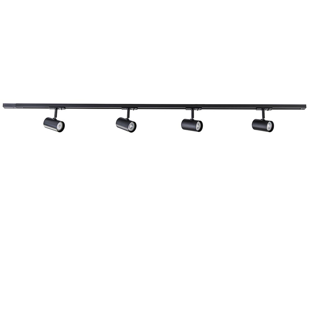 Ideaal om een ruimte extra uit te lichten of meer sfeer aan te brengen. Dit 1-fase railsysteem wordt geleverd inclusief 4 spots, beide uitgevoerd in het zwart. De rail heeft een lengte van 150 cm waar de spots gemakkelijk op kunnen worden verdeeld. Druk de spot in de rail en zet hem vast door de knop om te zetten. De spots kunnen verder nog draaien en kantelen. Bepaal dus zelf hoe u het licht wilt verspreiden. Het railsysteem heeft 1-fase, dit houdt in dat alle lampen tegelijk zullen worden in- en uitgeschakeld. Handig voor in een lange hal of slaapkamer, maar ook in de keuken of woonkamer past dit systeem perfect. De smalle rail en de cilindervormige spots geven een strak en modern geheel aan de ruimte. Het zwarte railsysteem is dimbaar met een externe dimmer.