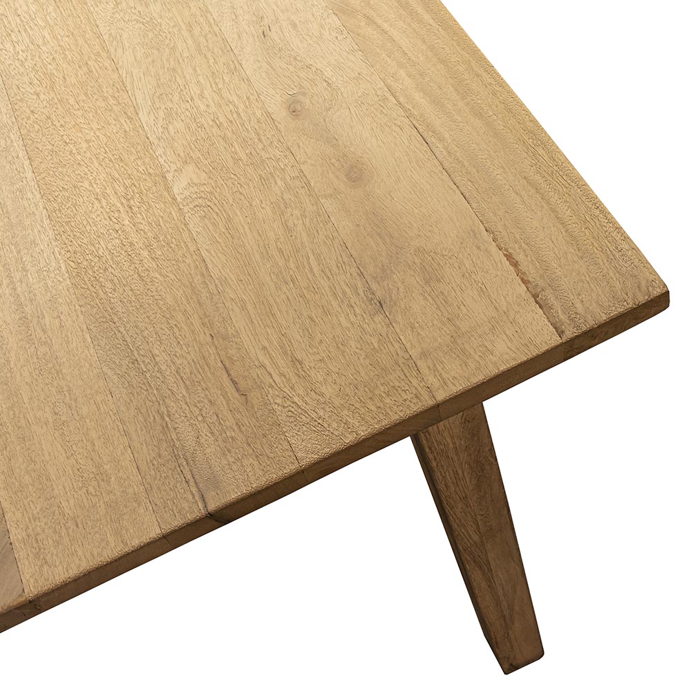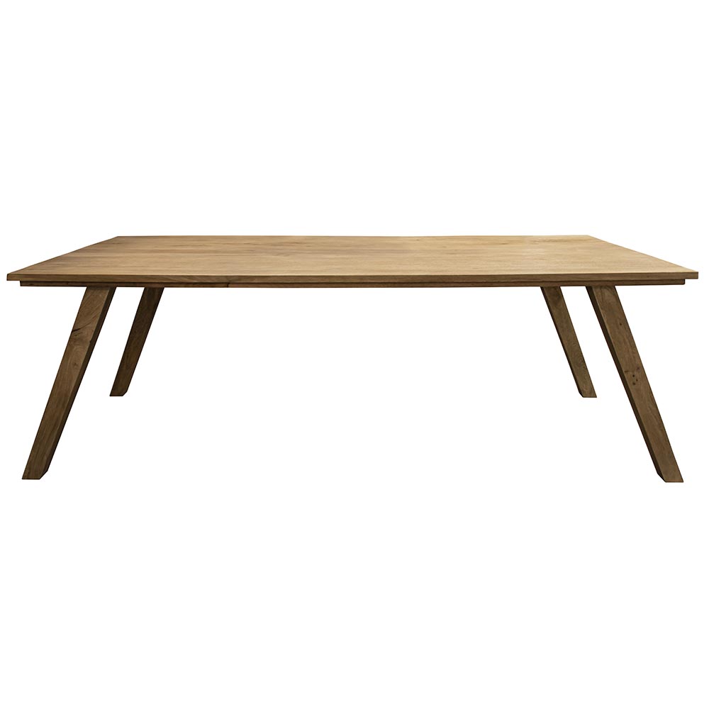Een stoere rechthoekige eettafel die gemaakt is van Mangohout. Dit is echter bijna niet te zien omdat het hout gebleekt en licht geborsteld is. Dit zorgt ervoor dat het hout een totaal andere look dan normaal mangohout krijgt. Het mangohout is als laatste afgewerkt met een matte blanke lak. Hierdoor laat het geen vlekken door en is het makkelijk met een vochtige doek schoon te maken. De robuuste tafel heeft een afmeting van 220×100 cm is biedt genoeg ruimte voor 6 personen