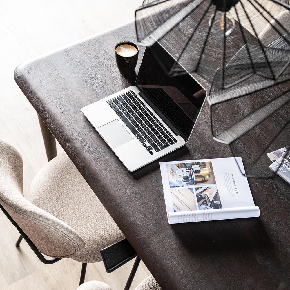 Robuust met een strakke vormgeving. Deze rechthoekige eettafel is volledig gemaakt van mangohout en uitgevoerd in het bruin. De grove nerven en de kleur maken de tafel prima geschikt voor een landelijke of industriële woonstijl. De eettafel heeft een blad met een lengte van 250 cm en een breedte van 100 cm. Ideaal om lekker aan te dineren of borrelen. Het blad loopt schuin af en heeft een dikte van 3,5 cm. De slanke poten geven de tafel een ruimtelijke look en zorgen dat er genoeg ruimte is voor 6 stoelen.