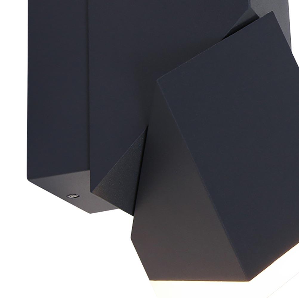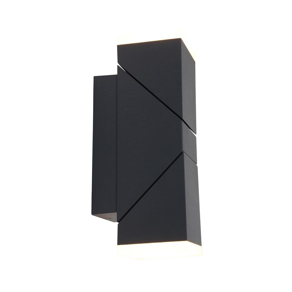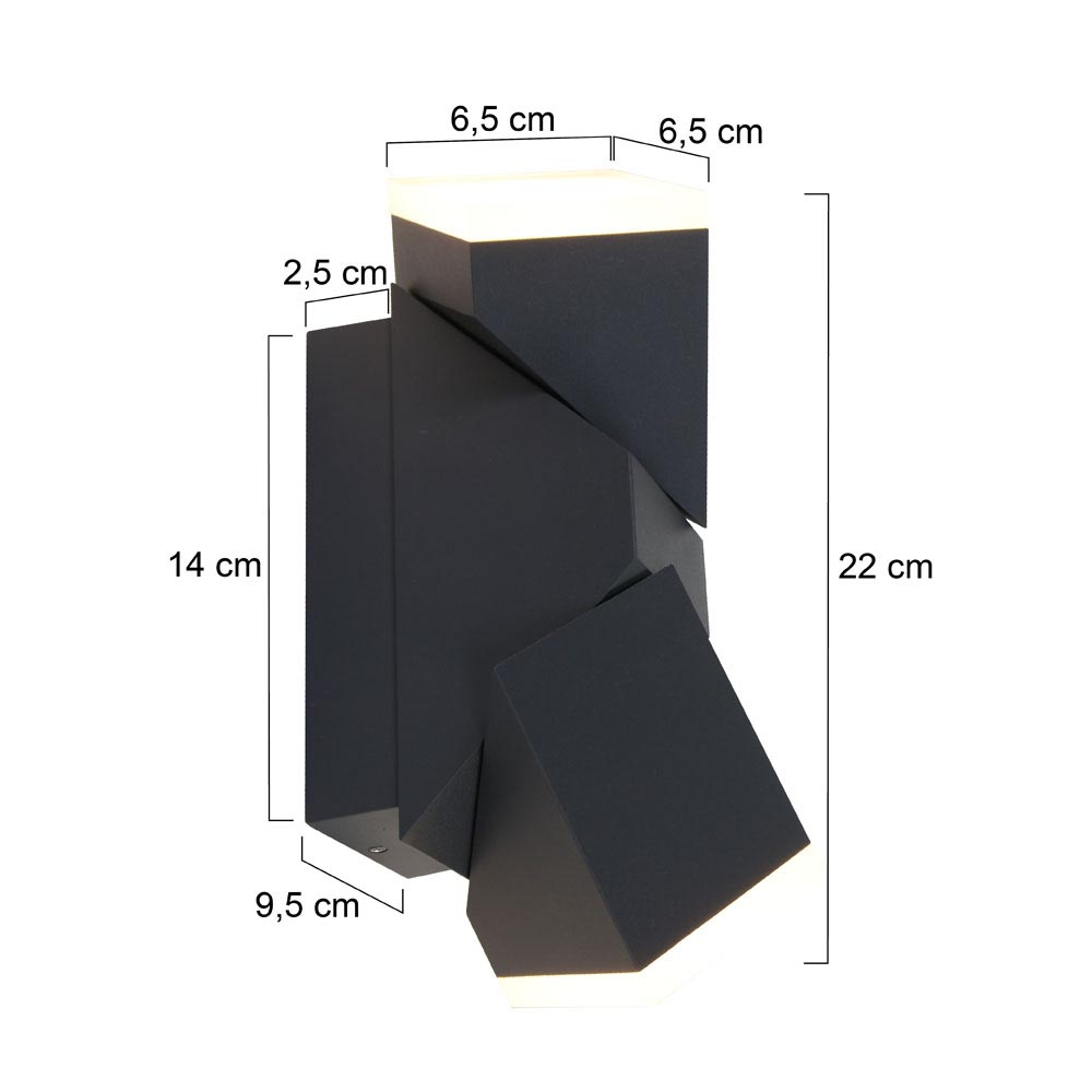 Een bijzonder ontwerp met een bijzonder effect. Deze moderne LED buitenlamp lijkt een gewone rechthoekige te zijn, maar schijn bedriegt. De buitenlamp heeft namelijk 2 verstelbare kappen die ieder 340° kunnen draaien. Zo kunt u er voor kiezen de buitenlamp als een gewone up en downlighter te gebruiken, of de kappen helemaal naar wens te draaien zodat er een persoonlijk lichtspektakel ontstaat. De behuizing is gemaakt van aluminium en afgewerkt met 2 kunststof kappen. Dit maakt de buitenlamp IP54 goedgekeurd. De buiten wandlamp is uitgevoerd in het zwart en geeft een sfeervolle warm witte verlichting.