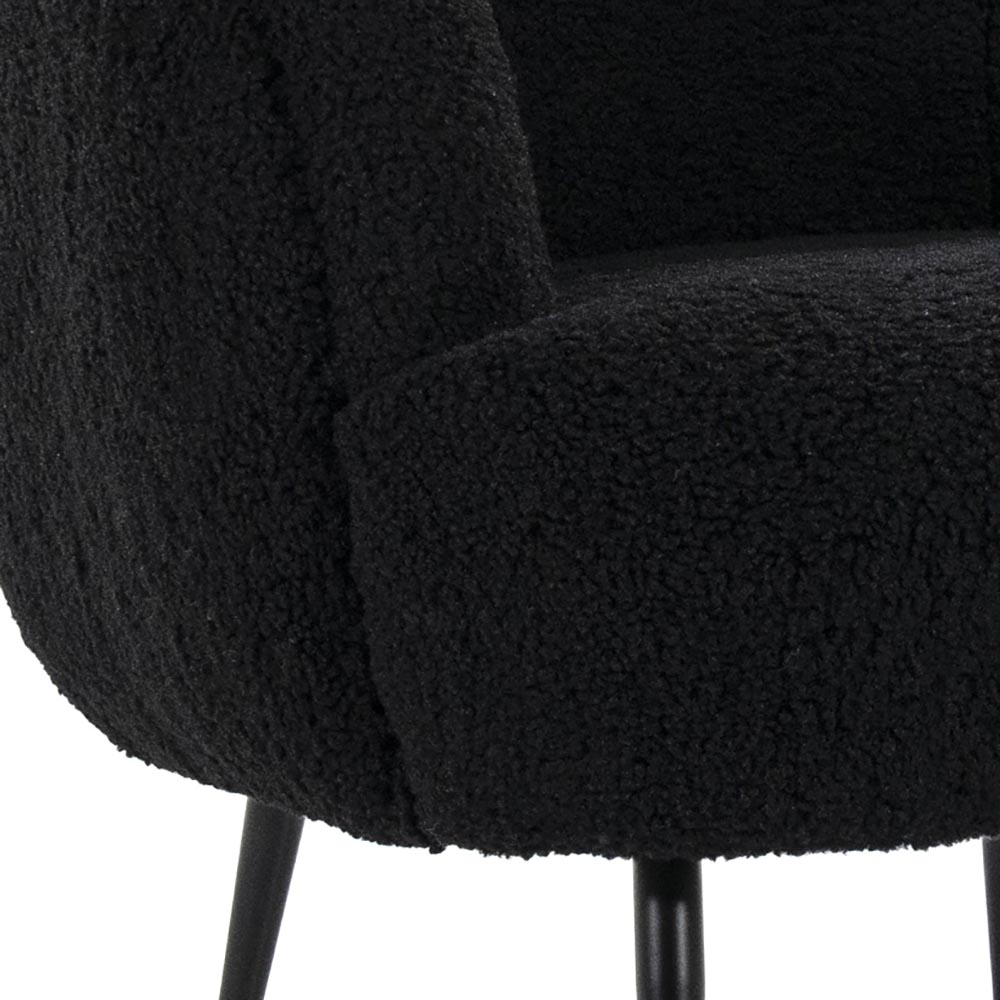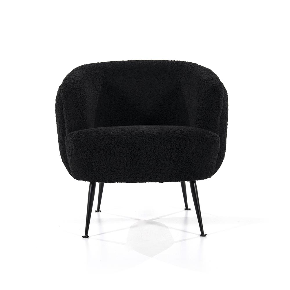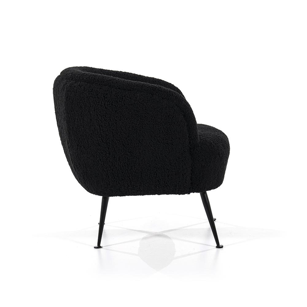 Een leuk en trendy fauteuil dat is uitgevoerd in het teddy zwart. De stoel maakt de woonkamer of slaapkamer helemaal af en biedt een fijn comfort. De stoffen zitting wordt ondersteund door slanke metalen pootjes die ook in het zwart zijn uitgevoerd.