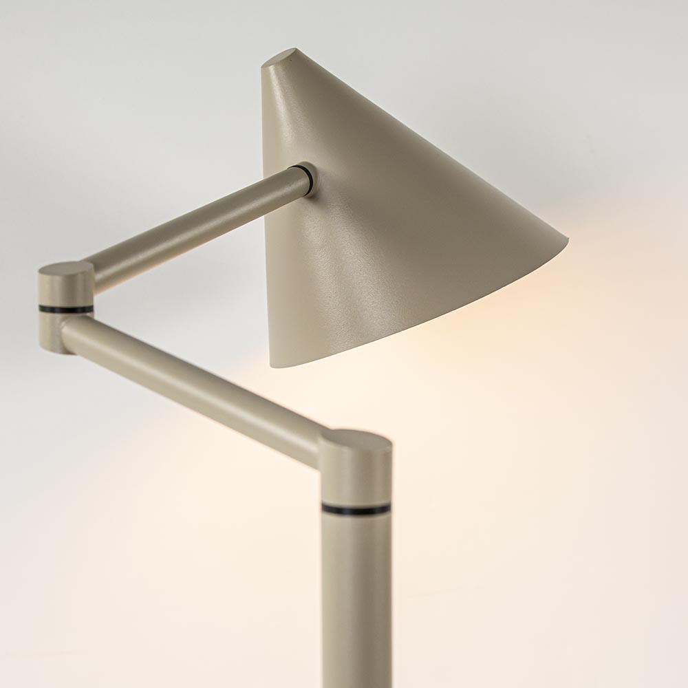 Deze tafellamp past perfect in een retro of vintage interieur. De tafellamp is gemaakt van metaal en uitgevoerd in de kleur zand. Dit geeft de lamp echt die vintage uitstraling. Het armatuur is verstelbaar door de arm te kantelen en de kap te draaien. Zo kunt u de lamp helemaal naar wens verstellen. Ook ideaal voor op een bureau. De retro tafellamp heeft een schakelaar op het armatuur en is voorzien van een zwart snoer met een lengte van 180 cm. De zandkleurige tafellamp wordt geleverd exclusief lichtbron.