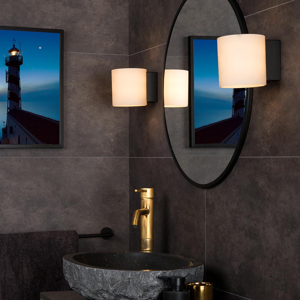 Vlak deze kleine wandlamp niet uit, want zijn effect is groot zat. De wandlamp is IP44 goedgekeurd en dan ook perfect geschikt voor de badkamer. De wandlamp bestaat uit een zwart metalen bevestiging en een opaal glazen kap. De combinatie geeft de badkamerlamp een tijdloze uitstraling die zowel in een modern, retro of design interieur kan worden toegepast. De cilinder glazen kap behuisd een G9 fitting. De badkamer wandlamp wordt geleverd zonder lichtbron.