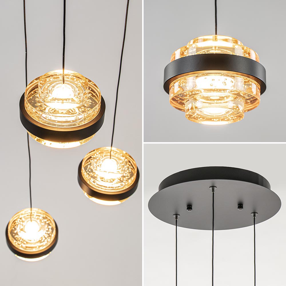 Een sfeervolle toevoeging voor boven een ronde eettafel of salontafel. De kappen hebben een aparte vorm en zijn voorzien van LED verlichting. De kappen zijn deels van massief glas en deels mat zwart metaal. Dit geeft de lamp een luxe uitstraling. Het glas is voorzien van luchtbelletjes wat de hanglamp een speels effect geeft. De hanglamp is gemakkelijk in hoogte aan te passen.