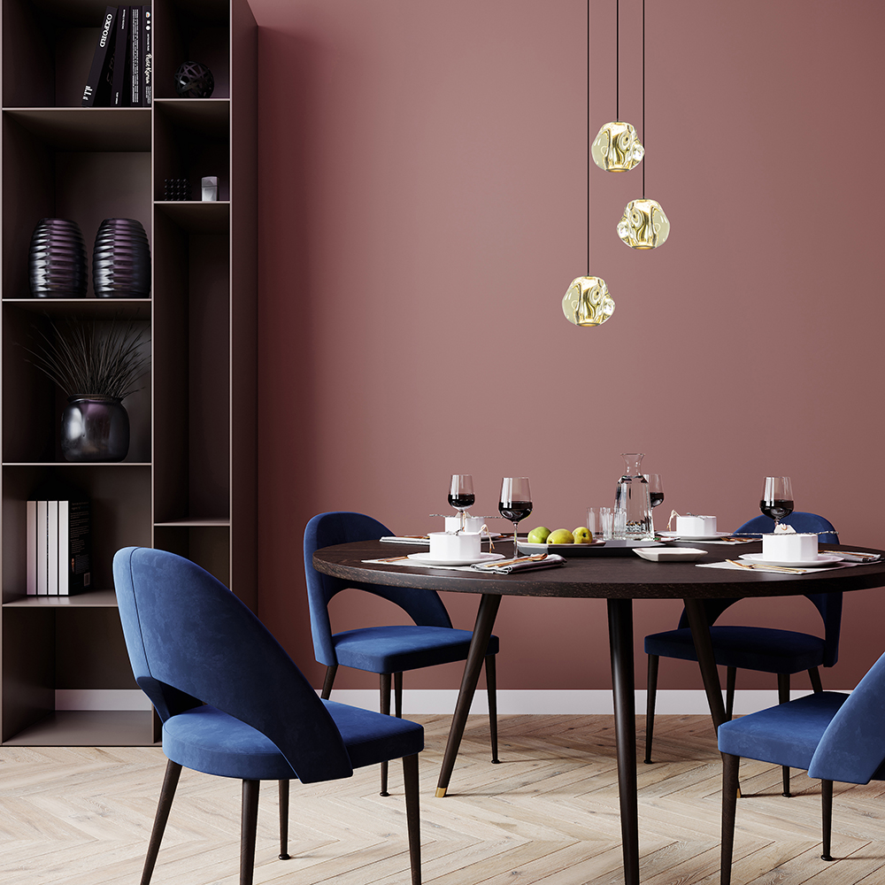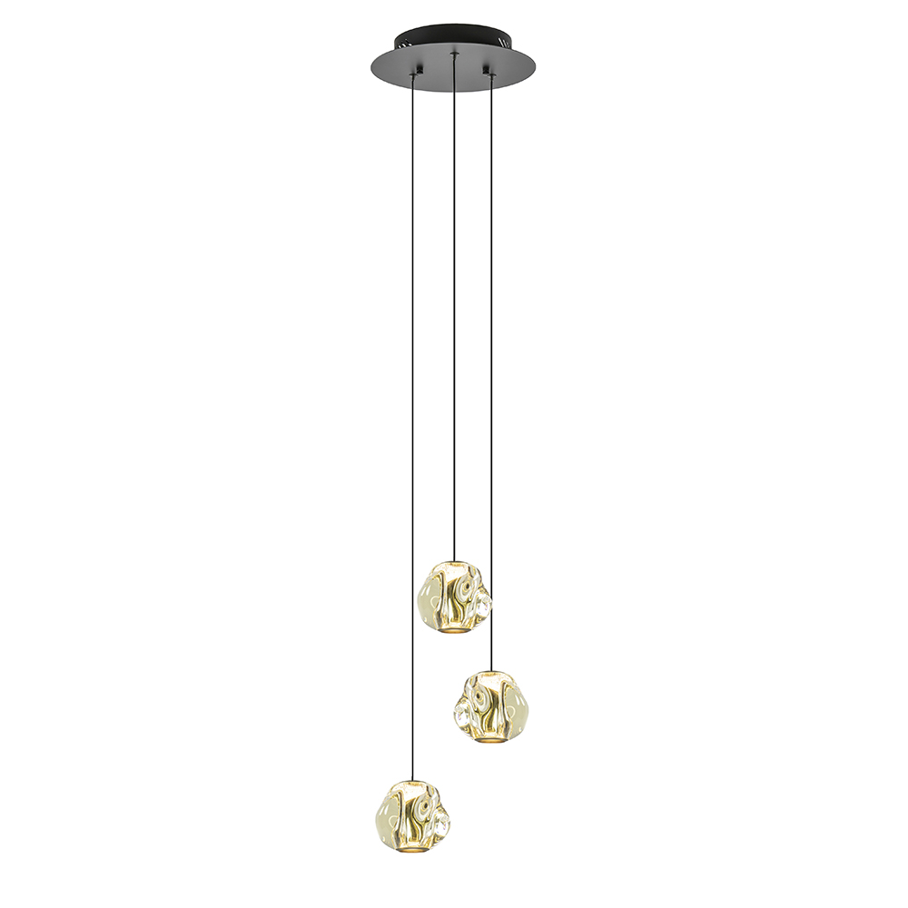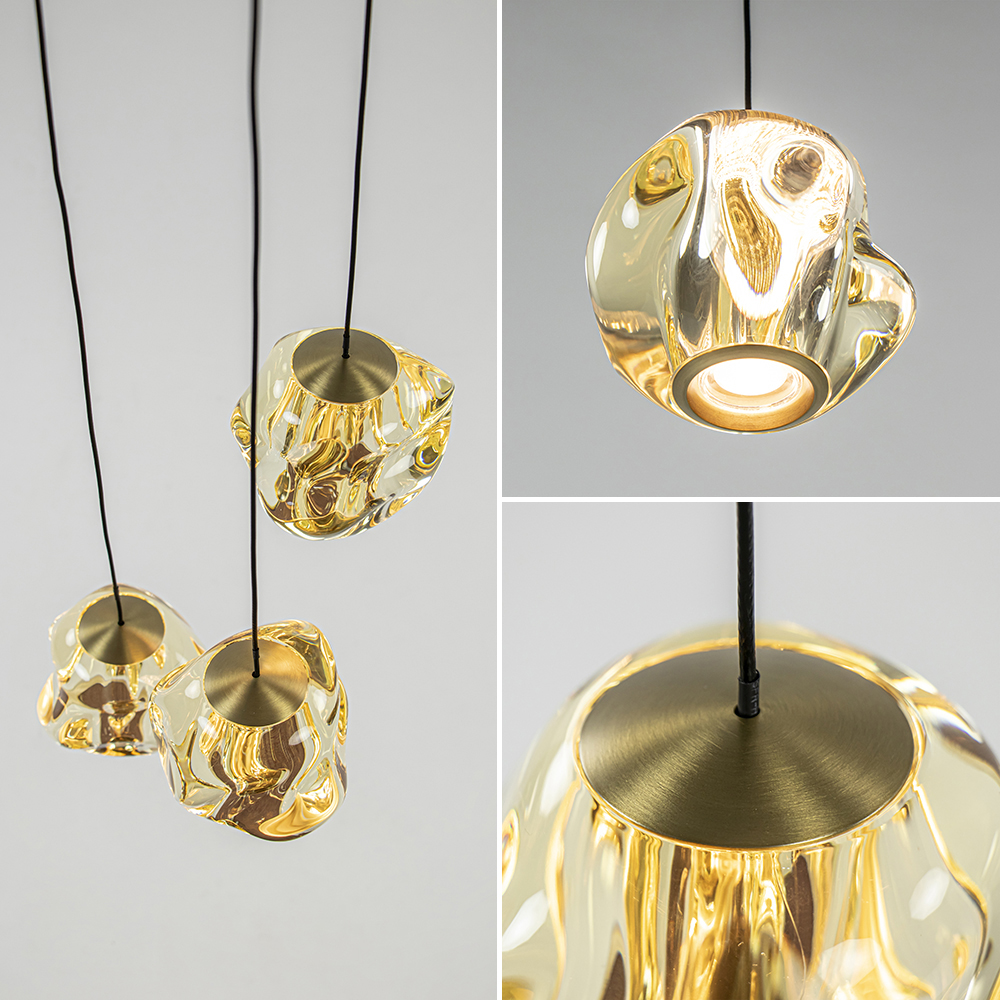 Een prachtige stijlvolle 3-lichts hanglamp die de eet- of woonkamer elegant verrijkt. De LED hanglamp heeft organische kappen van glas in de kleur amber. Dit is gecombineerd met metalen details in het mat zwart en brushed gold. De samenstelling geeft een glamoureuze uitstraling aan de lamp. De kappen zijn van binnen voorzien van geïntegreerd LED en verspreiden mooi en sfeervol warm wit licht naar beneden. Dit is dimbaar middels een externe dimmer (exclusief). De ronde 3-lichts hanglamp is gemakkelijk in hoogte te verstellen en heeft een maximale hoogte van 165 cm.