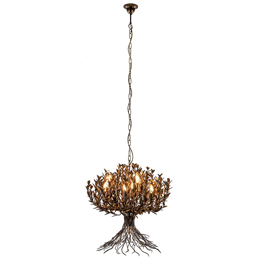 Deze prachtige decoratieve hanglamp is een ware eyecatcher in het interieur. De hanglamp is rond van vorm en volledig gemaakt van metaal in de kleur rustiek (bruin/brons). Dit geeft de lamp een klassieke chique look die mooi past in diverse woonstijlen. De lamp is een mooie toevoeging boven een ronde eettafel, in een vergaderruimte of in een vide. De maximale hoogte van de lamp is 200 cm. De stevige ketting en bevestigingsplaat zijn in dezelfde kleur als de lamp uitgevoerd. De ronde kap bestaat uit allerlei takken die zijn voorzien van blaadjes. Aan de onderzijde van de kap lijken de wortels zich te verspreiden. Tussen de blaadjes zijn negen E14 lichtpunten verspreid en aan de onderzijde is nog een extra GU10 spot te vinden. Deze licht het oppervlakte onder de lamp goed uit. Een prachtig design met een organische decoratieve look.