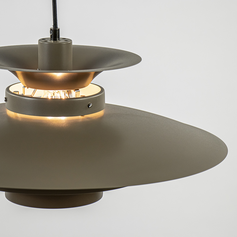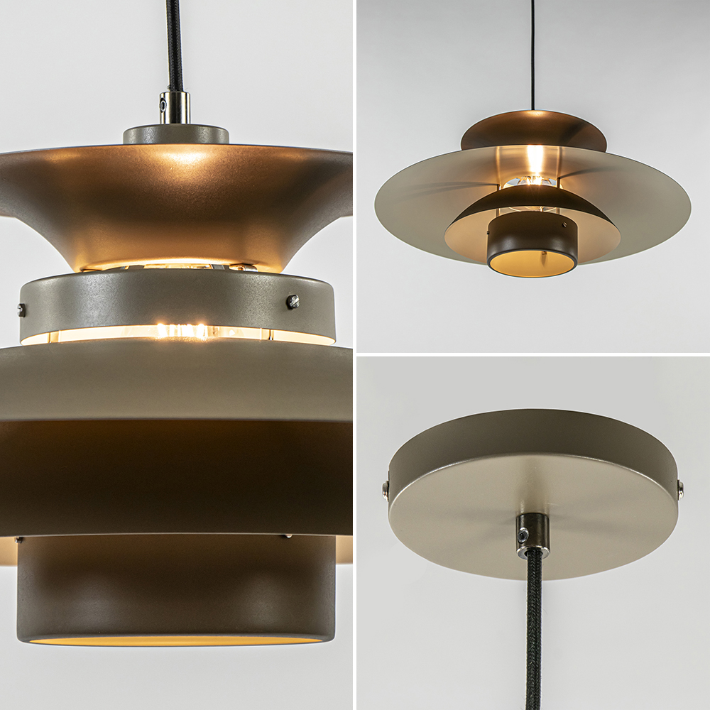 Deze stoere hanglamp heeft een retro look en feel. De ronde kap is gemaakt van metaal en uitgevoerd in het taupe. De ronde kap hangt aan een zwart snoer en heeft een maximale hoogte van 145 cm en is naar wens in te korten. Door z’n grootte is de lamp mooi toe te passen in de eetkamer, woonkamer of slaapkamer. De retro hanglamp is dimbaar middels een externe dimmer (exclusief) en wordt geleverd exclusief lichtbron.
