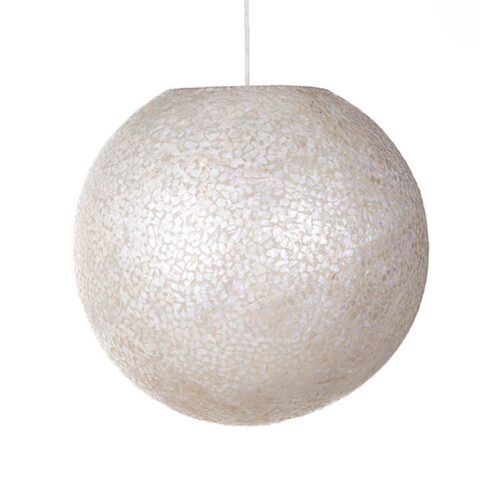 Breng een beetje het strand gevoel in huis met deze sfeervolle schelpen hanglamp. De ronde hanglamp met een doorsnede van 50 cm is gemaakt uit een fiberglas mal waar gebroken stukjes capiz schelpen in zijn gelegd. De schelpen zorgen voor een sfeervol effect wanneer de lamp is ingeschakeld. Door de witte/parelmoer schelpen krijgt de kap een frisse moderne uitstraling. De schelpen bol hanglamp hangt aan een transparant snoer die naar wens is in te korten en wordt aan het plafond bevestigd met een ronde nikkel bevestiging. De schelpen hanglamp is een mooi toevoeging aan een hal, slaapkamer of woonkamer. De schelpen hanglamp bol 40 cm wit/parelmoer wordt geleverd zonder lichtbron (E27).