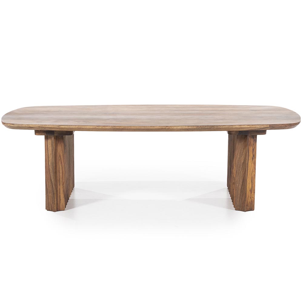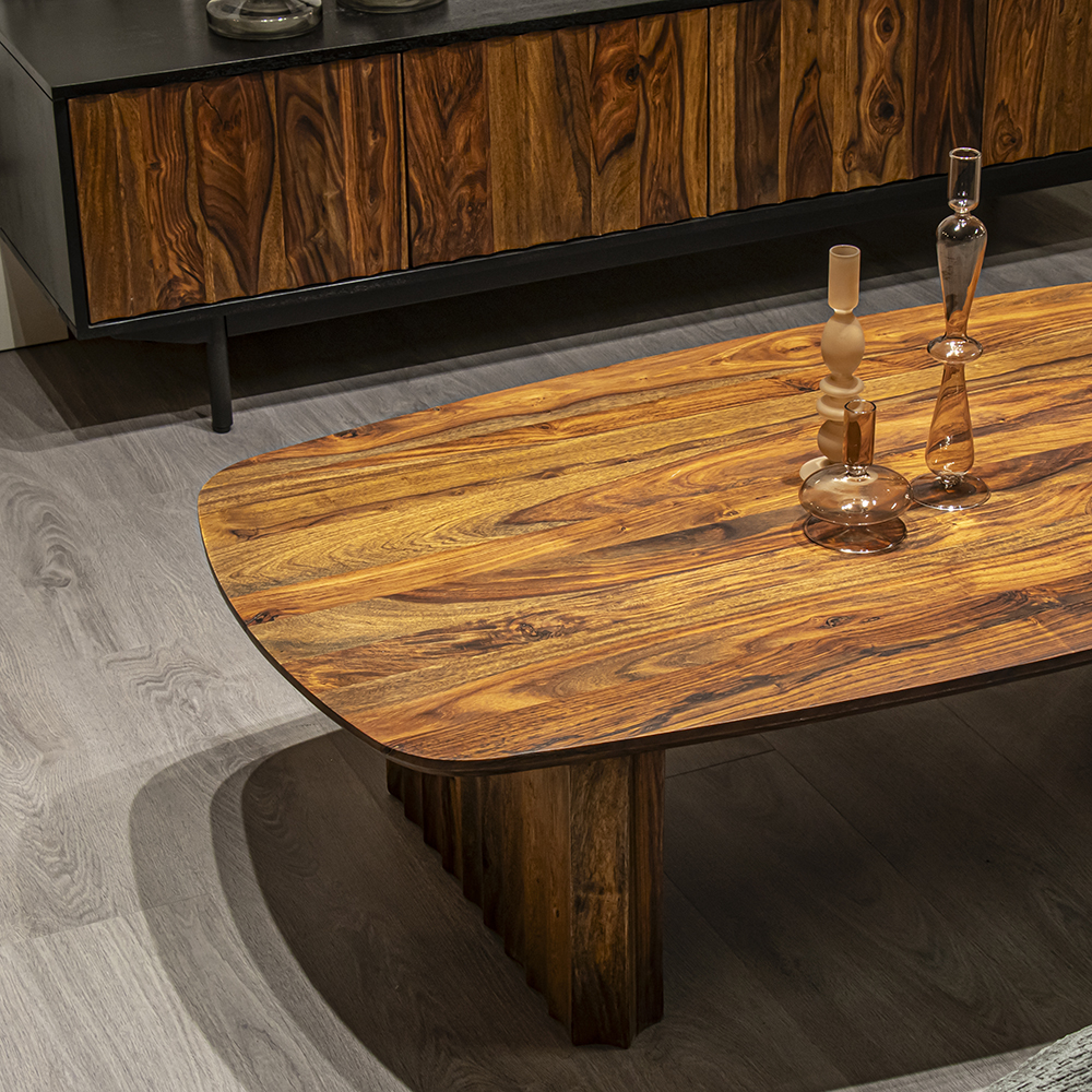 Stijlvolle salontafel die gemaakt is van sheesham hout in een warme bruine kleur. Sheesham hout is een duurzame houtsoort met een uniek nerfpatroon. Hierdoor is iedere tafel uniek. Dit geeft de salontafel een strakke, stoere look. Het blad heeft een licht ovale vorm. De robuuste poten hebben een gekartelde afwerking. Dit geeft de tafel een speelse look.