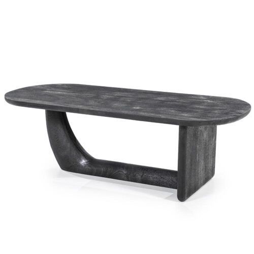 Een moderne salontafel in zwart mangohout met een sculpturale basis die zowel stabiliteit als designkracht uitstraalt.