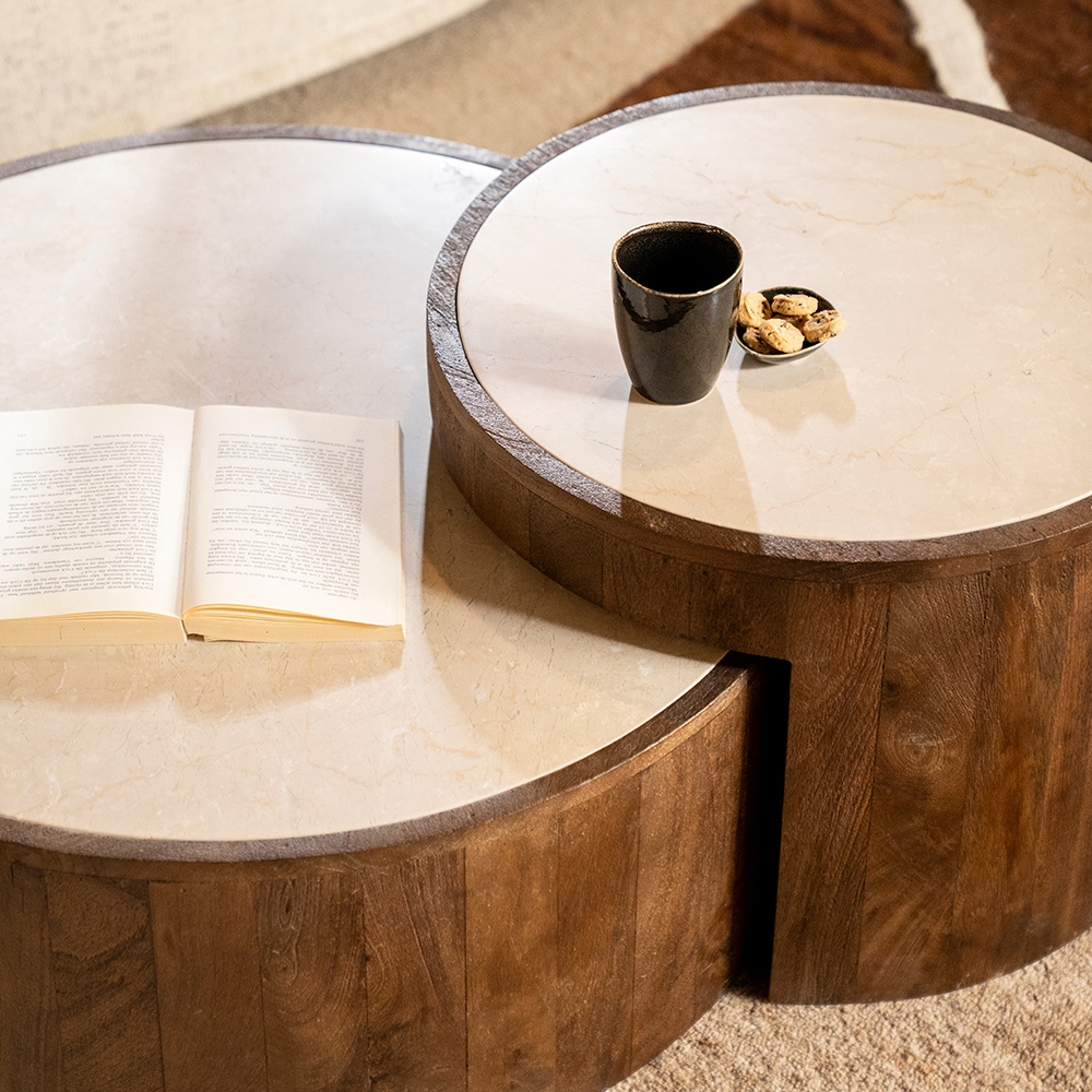 Deze set van twee ronde salontafels vormt een perfecte balans tussen natuurlijke elegantie en functioneel design. De tafels zijn uitgevoerd met een luxe marmeren blad in warme crèmetinten, omrand met een robuuste mango houten rand in een rijke, donkere houtkleur. Dit contrast zorgt voor een chique en stijlvolle uitstraling die moeiteloos in diverse interieurstijlen past. De tafels verschillen in hoogte, waardoor ze speels onder elkaar kunnen worden geschoven. Dit maakt ze niet alleen praktisch in gebruik, maar ook visueel aantrekkelijk. Het massieve mango houten onderstel zorgt voor een stevige basis en benadrukt het ambachtelijke karakter van het ontwerp.