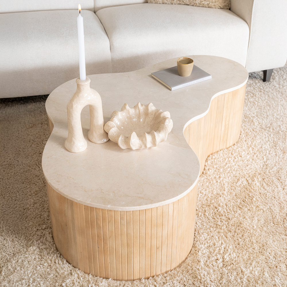 Deze stijlvolle salontafel is een opvallende toevoeging aan elk interieur door zijn organische, zachte vormen en natuurlijke uitstraling. Het prachtige blad van licht marmer geeft deze tafel een luxe, verfijnde look, terwijl de subtiele kleurvariaties en natuurlijke structuur ervoor zorgen dat elk exemplaar uniek is. De elegante, geribbelde houten basis benadrukt het warme en natuurlijke karakter van de tafel en zorgt voor een harmonieus geheel. Dankzij de zachte rondingen is de salontafel gemakkelijk te combineren en ideaal om los of in combinatie met een andere tafel uit de Kira lijn te gebruiken, wat een speels effect creëert. Een elegante eyecatcher voor wie houdt van een interieur waarin natuurlijke materialen en tijdloze elegantie centraal staan. Perfect om jouw woonkamer van een stijlvolle finishing touch te voorzien.