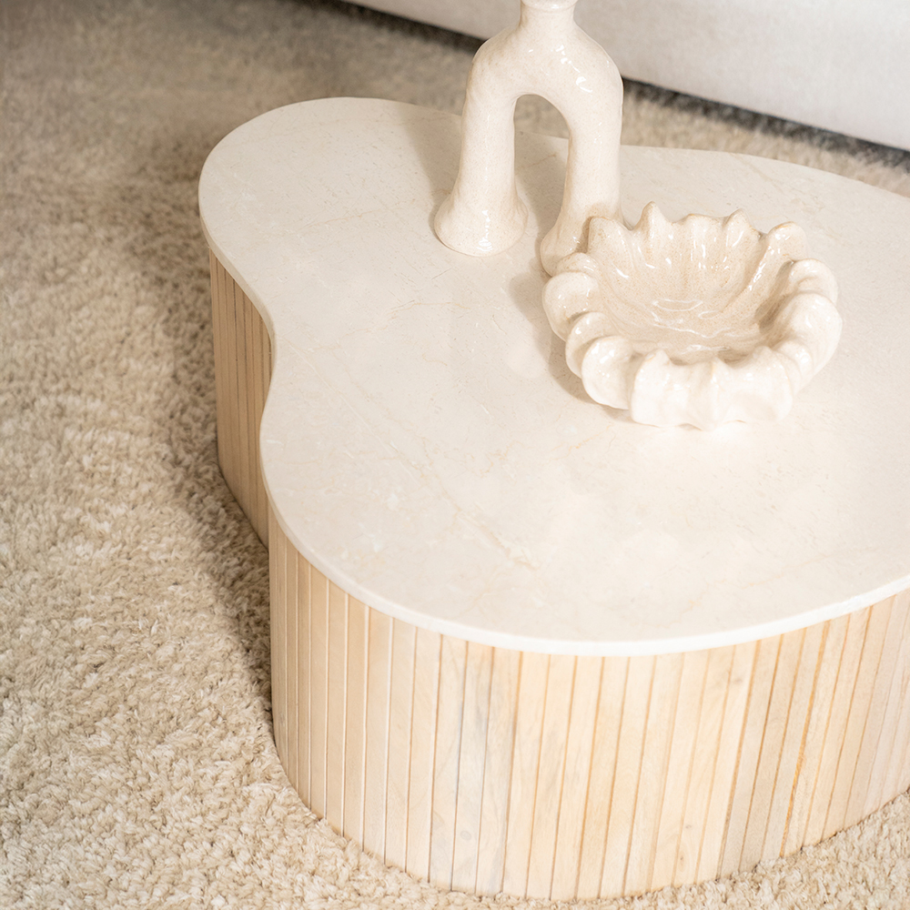 Deze stijlvolle salontafel is een opvallende toevoeging aan elk interieur door zijn organische, zachte vormen en natuurlijke uitstraling. Het prachtige blad van licht marmer geeft deze tafel een luxe, verfijnde look, terwijl de subtiele kleurvariaties en natuurlijke structuur ervoor zorgen dat elk exemplaar uniek is. De elegante, geribbelde houten basis benadrukt het warme en natuurlijke karakter van de tafel en zorgt voor een harmonieus geheel. Dankzij de zachte rondingen is de salontafel gemakkelijk te combineren en ideaal om los of in combinatie met een andere tafel uit de Kira lijn te gebruiken, wat een speels effect creëert. Een elegante eyecatcher voor wie houdt van een interieur waarin natuurlijke materialen en tijdloze elegantie centraal staan. Perfect om jouw woonkamer van een stijlvolle finishing touch te voorzien.