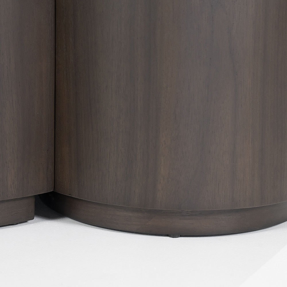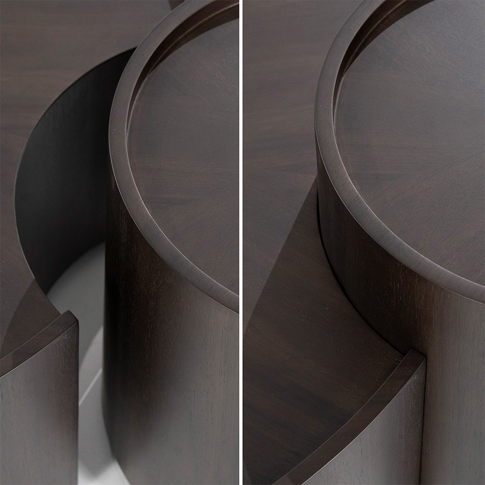 Breng verfijning en karakter in je woonkamer met deze salontafel set. Deze unieke set bestaat uit twee geïntegreerde ronde tafels van verschillend formaat die samen een opvallend, sculpturaal geheel vormen. Het warme, donkerbruine hout straalt luxe uit, terwijl de afgeronde vormen en verzonken tafelbladen zorgen voor een modern en harmonieus design. De kleine tafel is deels in de grote tafel geschoven, waardoor een dynamisch en praktisch ontwerp ontstaat. Ideaal voor het creëren van diepte en speelsheid in je interieur, zonder aan functionaliteit in te boeten. Gebruik de tafels samen of afzonderlijk.