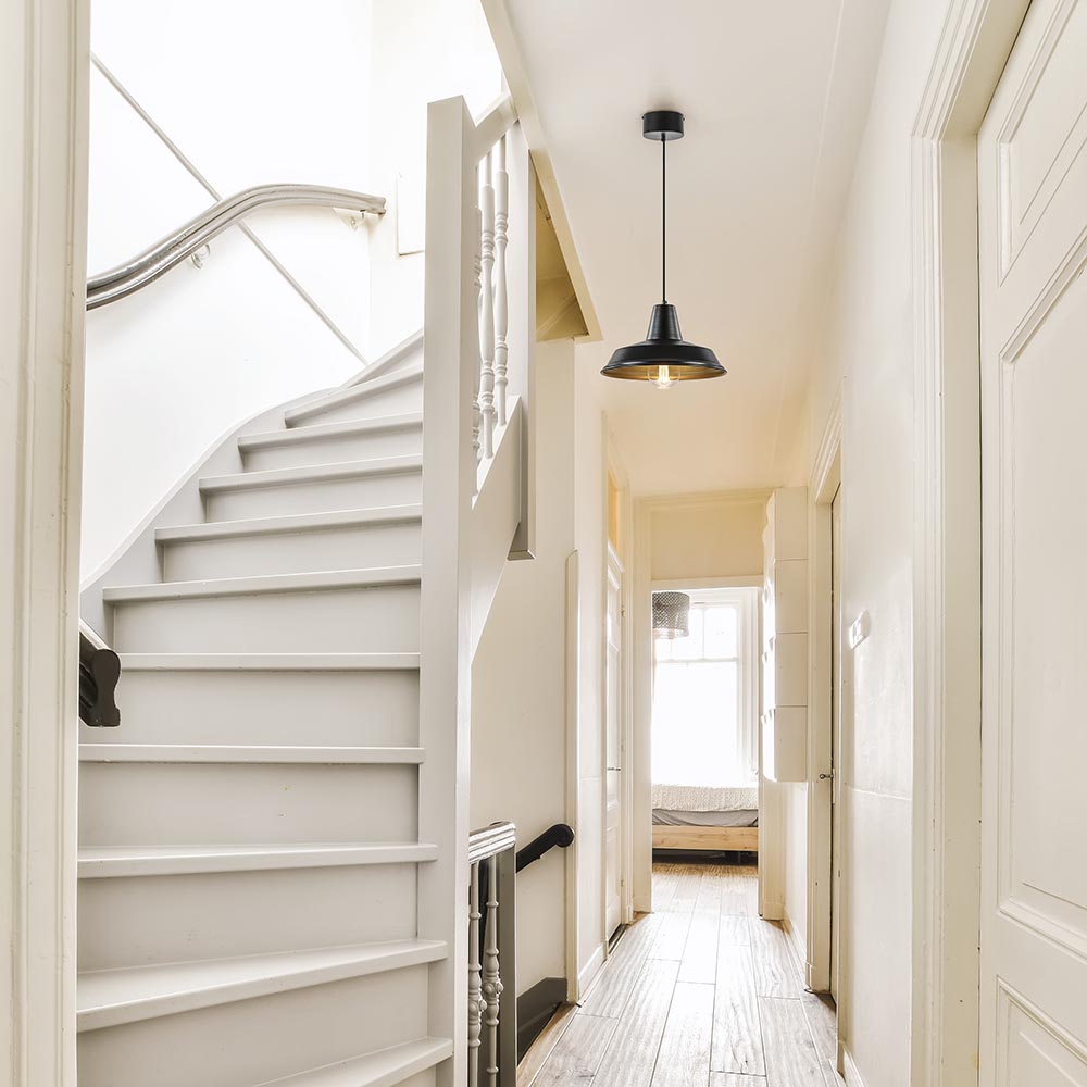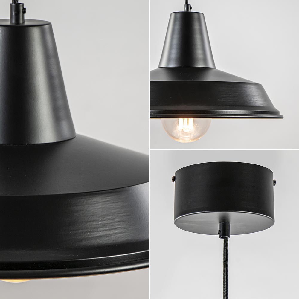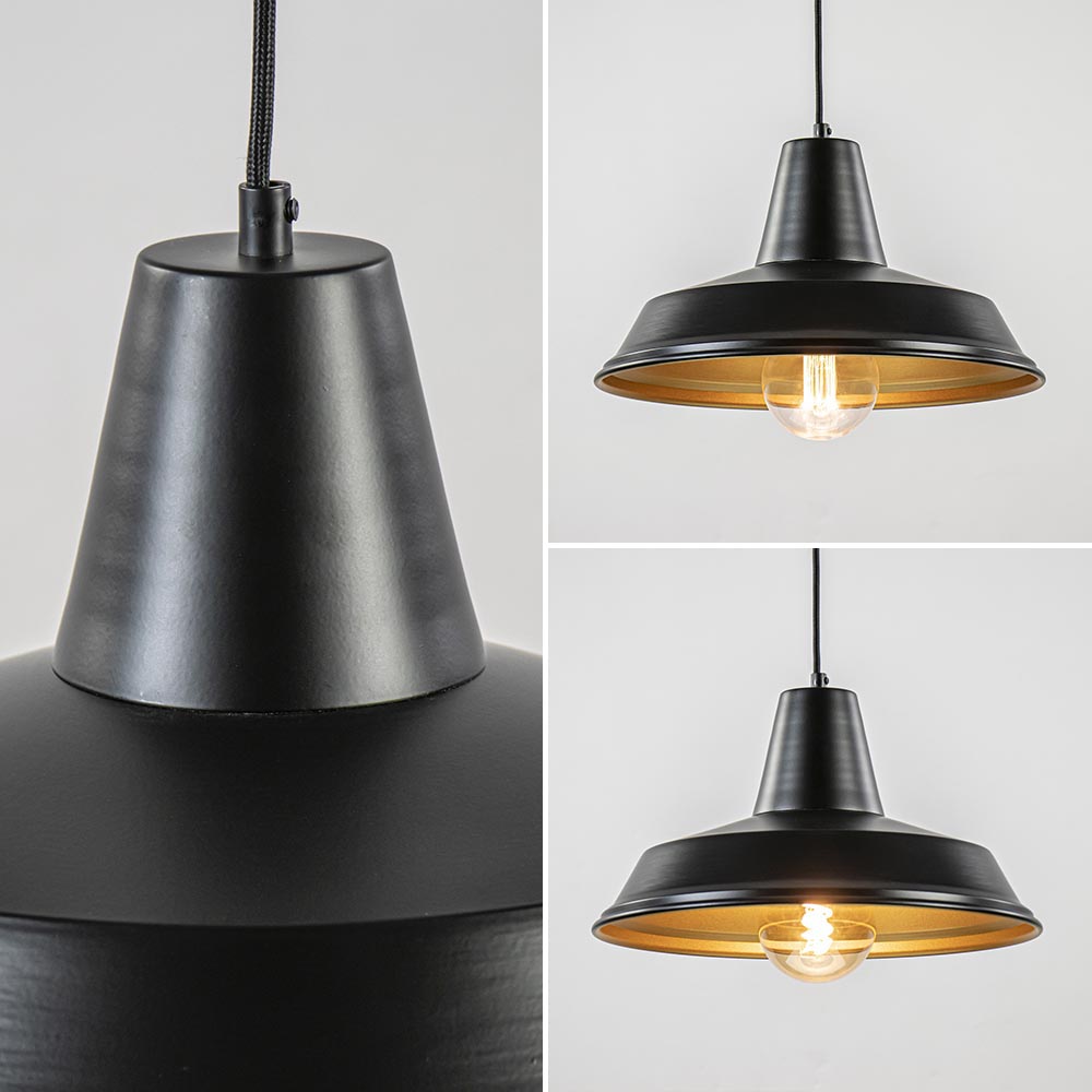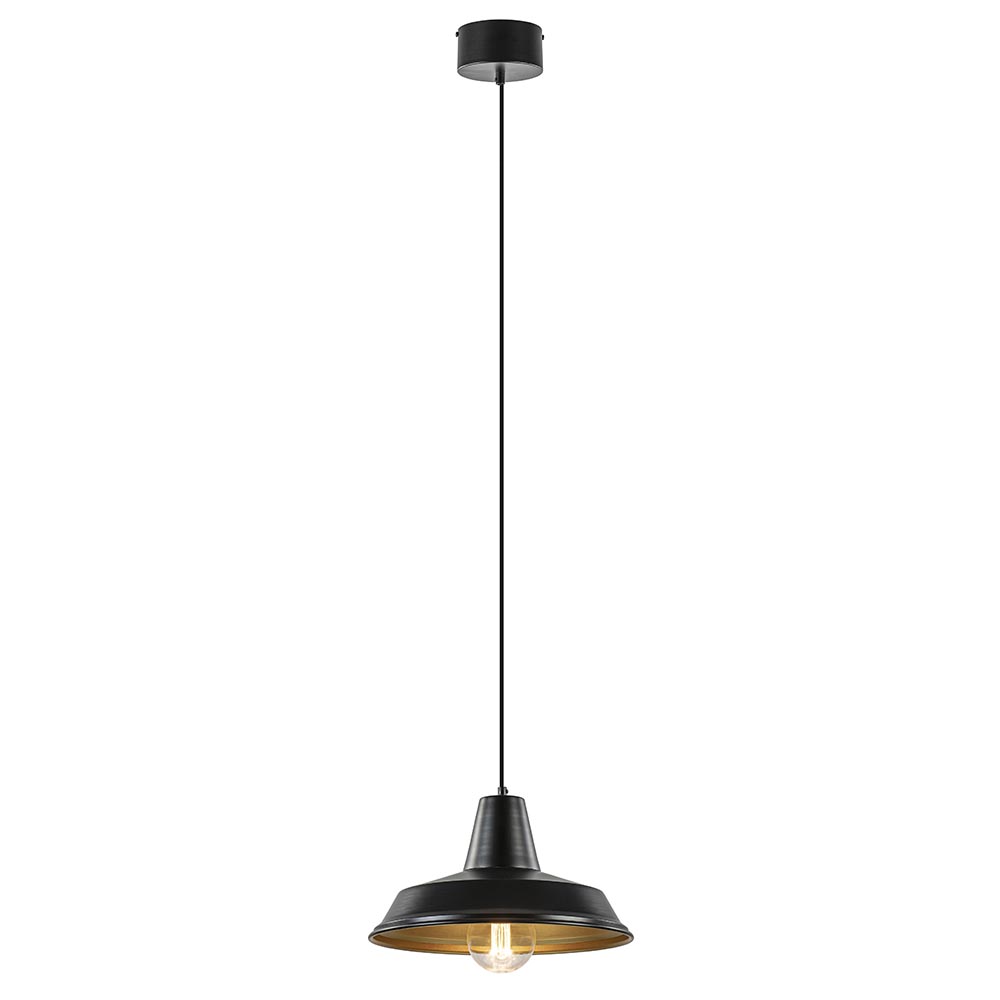 Scandinavisch, retro en vintage ineen. Deze kleine hanglamp is van meerdere markten thuis. De ronde hanglamp is gemaakt van metaal en uitgevoerd in het mat zwart met een gouden binnenzijde. De zwart met gouden kap hangt aan een zwart stof omwonden snoer dat naar wens is in te korten. De maximale hoogte van de hanglamp is 130 cm. De ronde bevestiging is net als de kap zelf uitgevoerd in het zwart. Dit maakt samen een mooi geheel. De hanglamp wordt geleverd exclusief lichtbron.