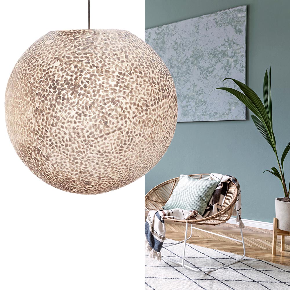 Breng een beetje het strand gevoel in huis met deze sfeervolle schelpen hanglamp. De ronde hanglamp met een doorsnede van 40 cm is gemaakt uit een fiberglas mal waar gebroken stukjes capiz schelpen in zijn gelegd. De schelpen zorgen voor een sfeervol effect wanneer de lamp is ingeschakeld. Door de witte/parelmoer schelpen krijgt de kap een frisse moderne uitstraling. De schelpen bol hanglamp hangt aan een transparant snoer die naar wens is in te korten en wordt aan het plafond bevestigd met een ronde nikkel bevestiging. De schelpen hanglamp is een mooi toevoeging aan een hal, slaapkamer of woonkamer. De schelpen hanglamp bol 40 cm wit/parelmoer wordt geleverd zonder lichtbron (E27).