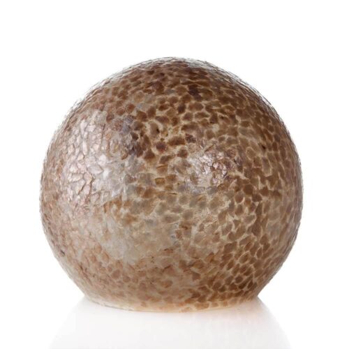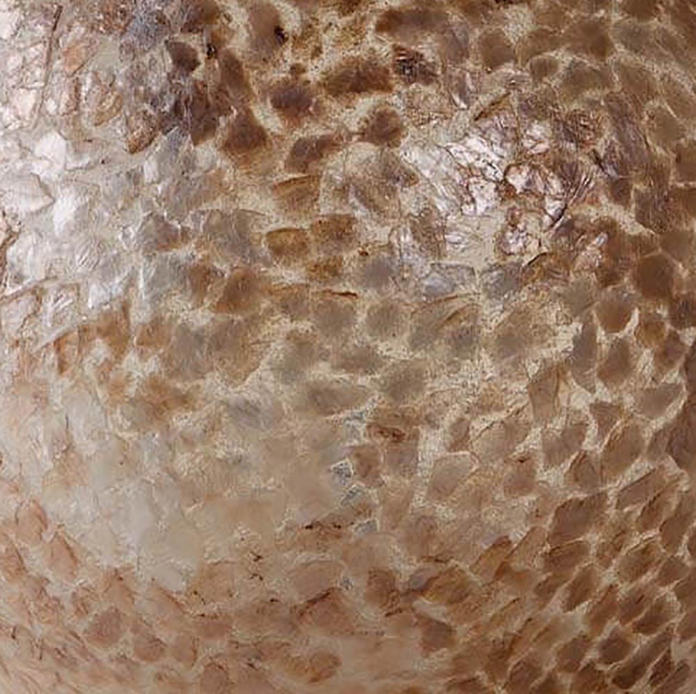 Sfeervolle tafellamp bol. Deze tafellamp is gemaakt van gebroken schelpen. Leuk om te zien wanneer hij niet brand en heel sfeervol als hij wel brand. Dit is geen tafellamp om bij te lezen, maar echt meer om een sfeer te creeëren in de woonruimte. De kleuren zijn heel gemeleerd van creme-beige-bruin en goud, uitermate geschikt voor een beach-ibiza look of lifestyle interieur.