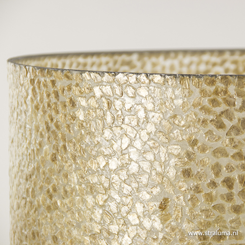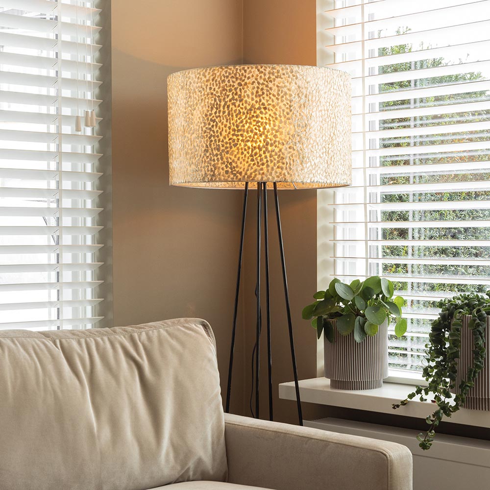 Een leuke schelpen vloerlamp met een grote decoratieve kap. De schelpen kap heeft een gouden kleur wat mooi past bij de zwarte metalen voet. Door de kleur en de schelpen die in de kap verwerkt zitten, geeft de lamp een mooie sfeervolle verlichting. Deze vloerlamp is zowel aan als uit een mooie decoratieve toevoeging aan het interieur die zorgt voor een warme gezellige sfeer.