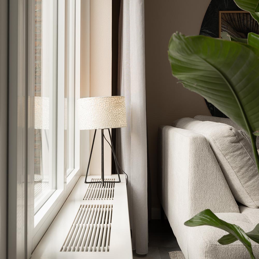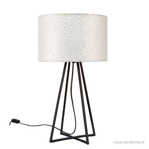 Een leuke moderne lamp met een decoratieve kap. De schelpen kap heeft een parelmoer witte kleur wat mooi past bij de zwarte metalen voet. Door de kleur en de capiz schelpen die in de kap verwerkt zitten, geeft de lamp een mooie sfeervolle verlichting. Deze tafellamp is zowel aan als uit een mooie decoratieve toevoeging aan het interieur die zorgt voor een warme gezellige sfeer.