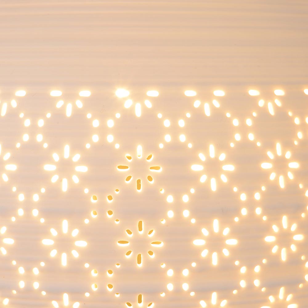 Wat een leukerd is dit. Het retro tafellampje is een kleine sfeermaker die, naast in een retro interieur, prima past in een landelijke of Oosterse woonstijl. De ronde tafellamp is gemaakt van porselein en uitgevoerd in het mat wit met een decoratief dessin. Het dessin geeft extra sfeer aan de lamp en zorgt dat het licht mooi kan verspreiden. De lichtbron plaatst u gemakkelijk door aan de onderzijde de fitting uit de lamp te halen. De porseleinen tafellamp heeft een zwart snoer van 150 cm met een knipschakelaar voor het aan/uit zetten van de lamp. De sfeervolle tafellamp wordt geleverd zonder lichtbron (E14).
