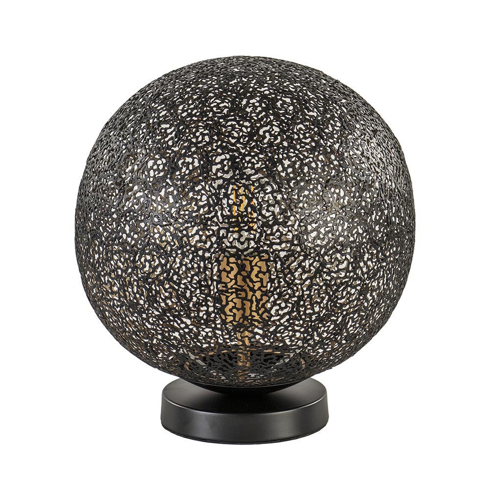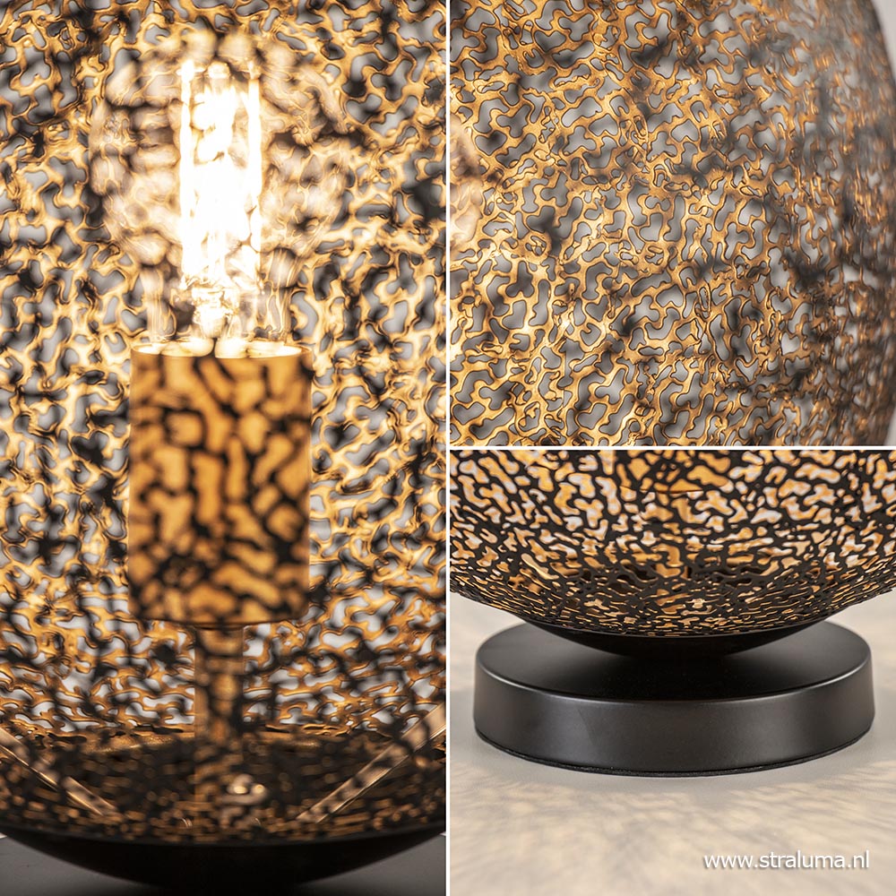 Stoer met een chique uitstraling. Deze moderne tafellamp doet een beetje denken aan koraal en is gemaakt uit kleine metaaldeeltjes die samen de ronde kap vormen. Het metaal is afgewerkt met een mat zwarte finish aan de buitenzijde en een gouden finish aan de binnenzijde. Het goud zorgt voor een luxe chique uitstraling en creëert tevens een sfeervolle warme gloed. Ook de fitting is afgewerkt in de kleur goud. De zwart gouden bol is bevestigd op een ronde metalen voet en heeft een zwart snoer van 155 cm, waarbij de schakelaar op 35 cm van de lamp zit. De kap is los te maken door de drie klepjes iets naar binnen te buigen. De moderne tafellamp wordt geleverd zonder lichtbron (E27).