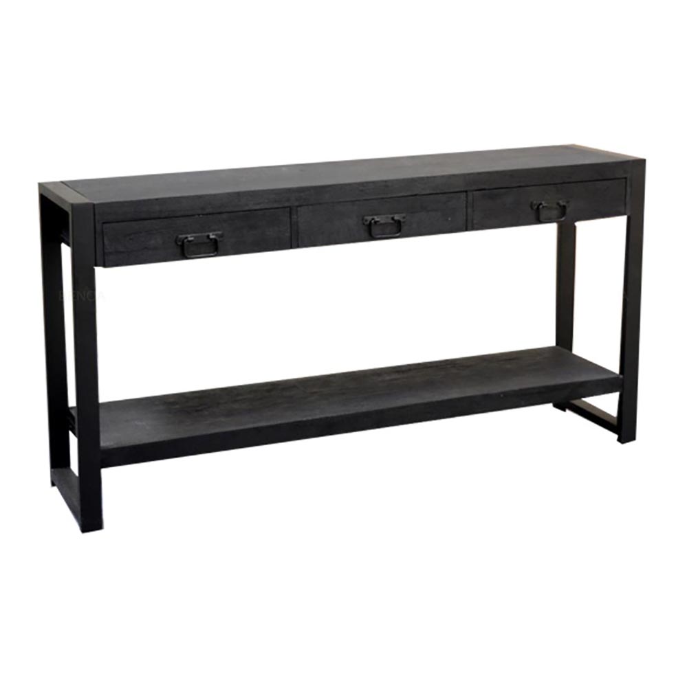 Wandtafel van mangohout. Het mangohout heeft een zwarte coating. De wandtafel bestaat uit een open plank en drie lades met metalen handgrepen. De donkere wandtafel heeft een stoere uitstraling.