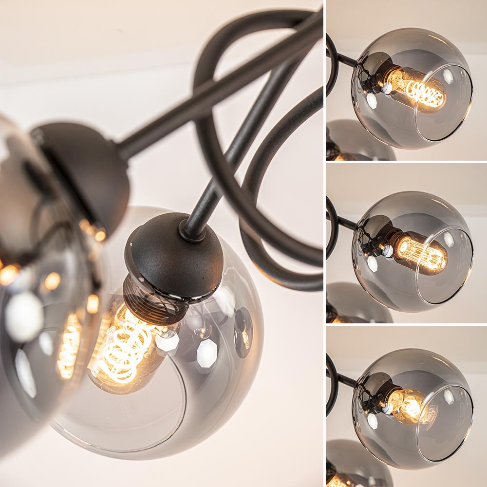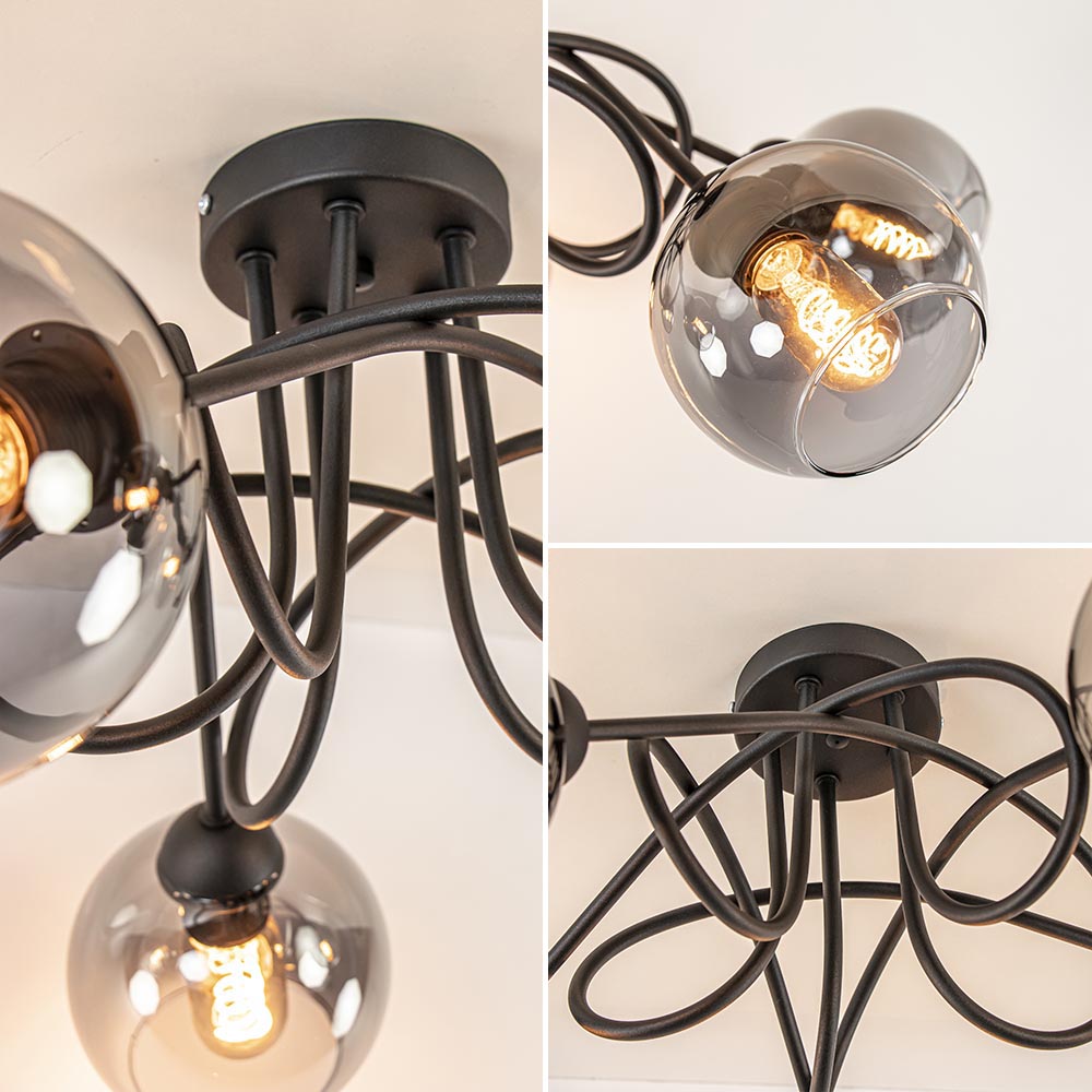 Sierlijke trendy 5-lichts plafondlamp. Deze mat zwarte plafondlamp is een leuke combinatie tussen stoer en sierlijk. Het fraaie armatuur loopt krullend in elkaar over. De smoke glazen bollen geven de lamp dat stoere en ook luxe randje. De lamp is leuk voor in een woonkamer, slaapkamer of grote hal. De lamp wordt exclusief lichtbronnen geleverd en is dimbaar middels een externe dimmer (exclusief).