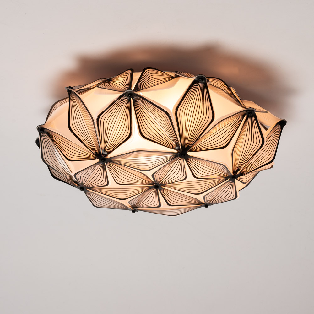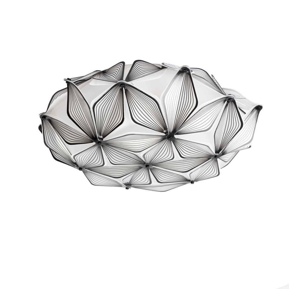 Highlights • Iconische design plafondlamp en wandlamp in één • Grafisch lijnenspel met transparante, gelaagde structuur • Creëert een uniek licht- en schaduwspel op muur en plafond • Slim magneetsysteem voor eenvoudig verwijderen van de kap • Ook geschikt voor wandmontage met extra verstevigingskabel • Verkrijgbaar in drie maten: S, M en L