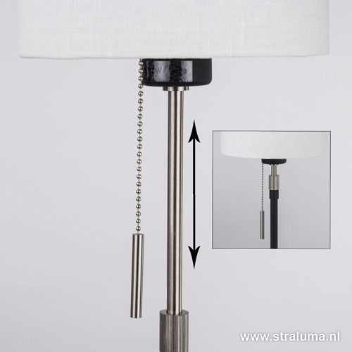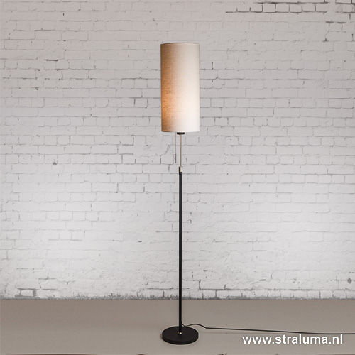 Mooie vloerlamp uit de serie ‘ Corona ‘. Deze staande lamp bestond al eerder in een hele stalen uitvoering ook toen was het al een hele fijne vloerlamp. Nu hebben ze er een extra uitvoering aan toegevoegd met zwarte onderdelen helemaal volgens de laatste trend. Ideaal is het formaat van de Corona vloerlamp. Hij is smal en rond en heel geschikt voor een klein hoekje zoals bijvoorbeeld naast of achter de bank. Door een stukje techniek is hij ook nog in hoogte te verstellen. Hierdoor kunt u zelf de uitstraling van de zwarte vloerlamp bepalen. De cilinder kap is gemaakt van een linnen stof, deze is iets grover en echt van deze tijd. Hij is niet spierwit, maar net van het wit af. Echt een frisse verschijning in combinatie met het staal en zwart.
