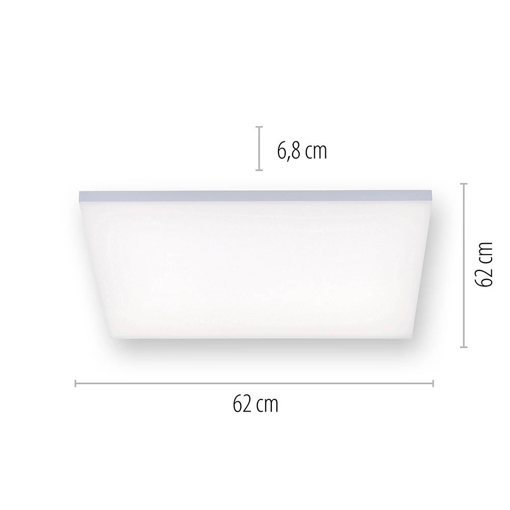 – Afmetingen: 62CM x 62CM x 7CM – Plafond bevestiging: 40CM x 40CM x 4CM – Geïntegreerd LED – Wit – RGB/CCT – Dimbaar (inclusief) – 3600 Lumen – 2700-5000 Kelvin – Inclusief afstandsbediening – Geheugenfunctie