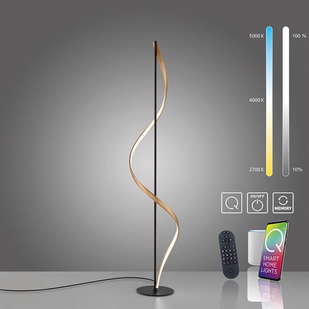 Deze sierlijke vloerlamp is een verrijking voor het interieur. De spiraal geeft de lamp een hoog designgehalte wat wordt versterkt door de antraciet/gouden uitvoering. De staande lamp is voorzien van LED verlichting. De smart vloerlamp is bedienbaar middels een meegeleverde afstandbediening of de smartphone en kan worden geïntegreerd in bestaande smart home-systemen die gebaseerd zijn op de ZigBee-standaard. Kies gemakkelijk en snel voor de juiste sfeer en pas deze aan naar ieder moment van de dag. Zo is de intensiteit en de kleurtemperatuur in te stellen. De smartlamp is voorzien van een memory functie en heeft een snoer met een lengte van 250 cm.