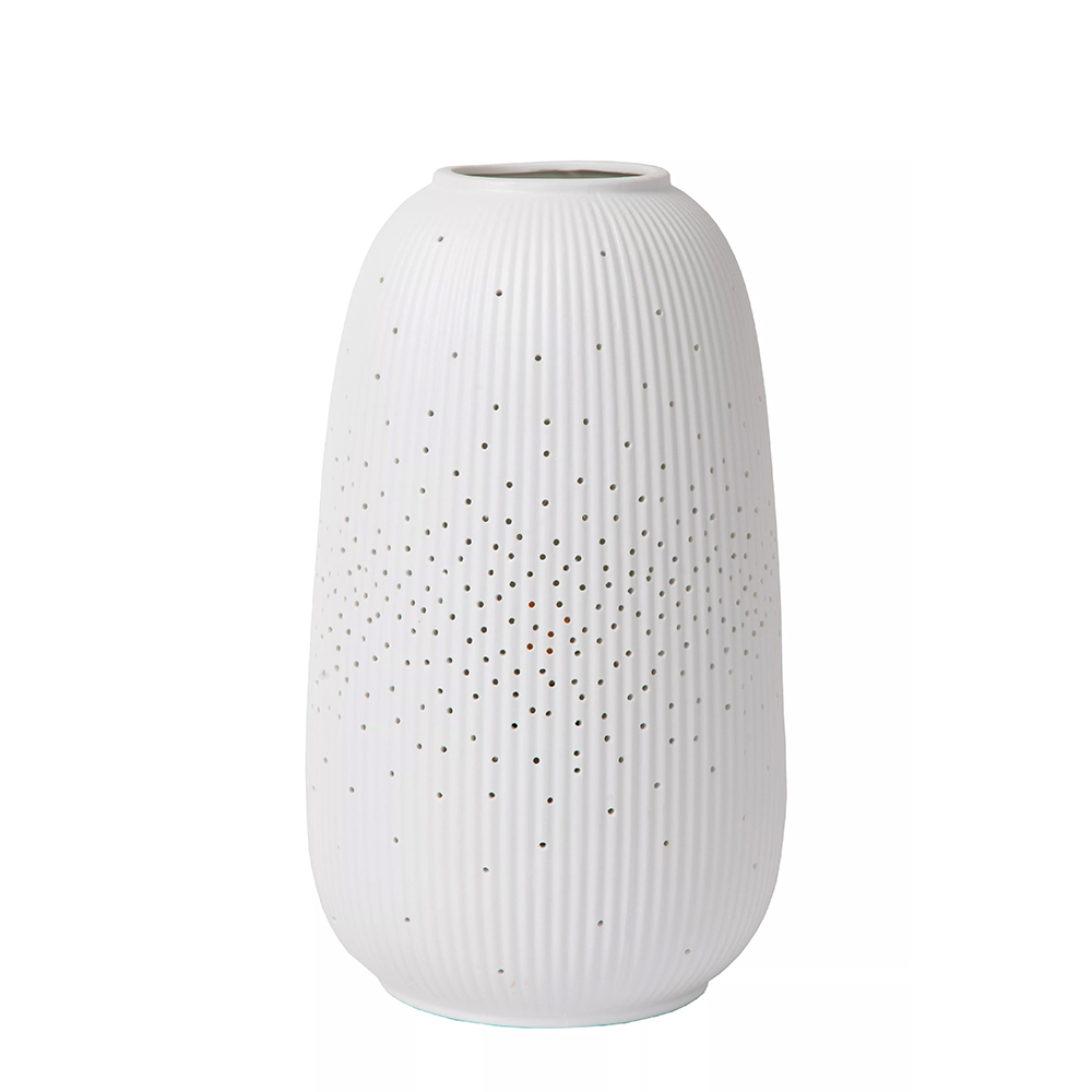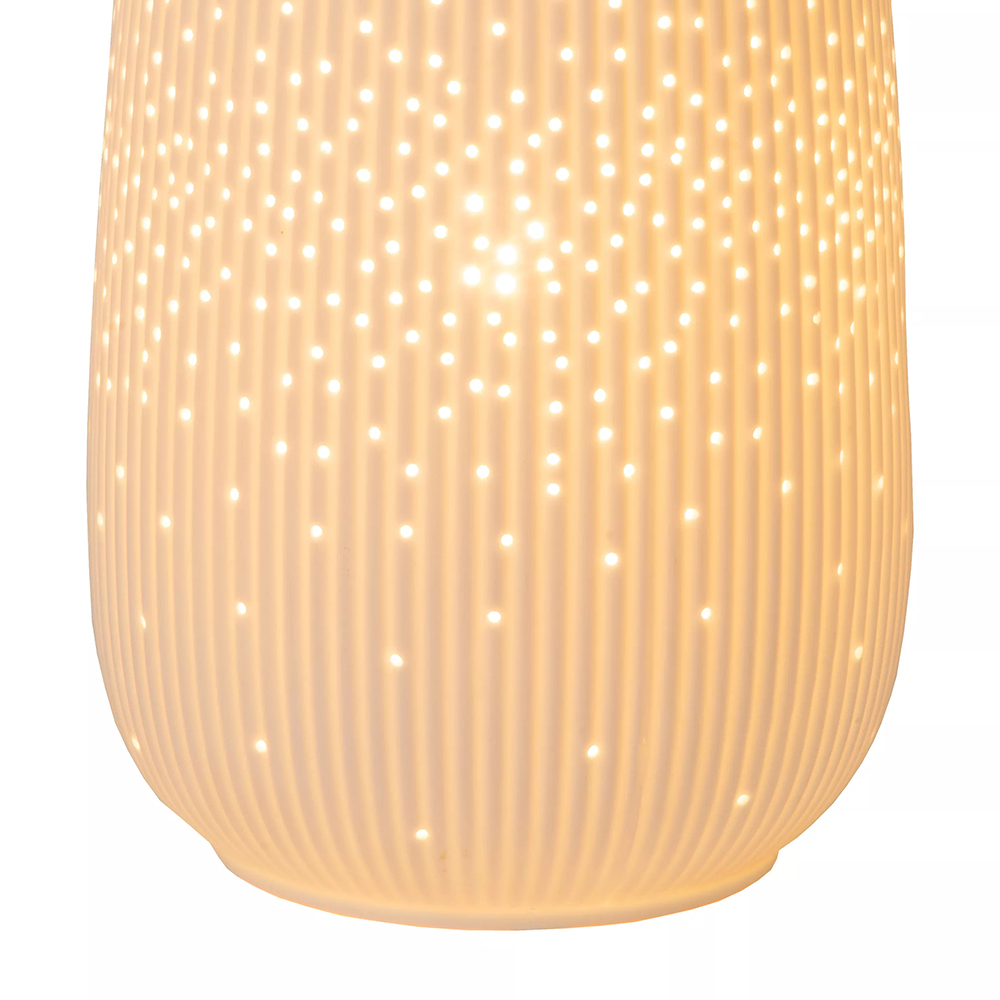 Perfect voor een babykamer of gezellig als extra sfeerlicht in de woonkamer. Deze tafellamp is vervaardigd uit hoogwaardig porselein en uitgevoerd in het wit. Het porselein is voorzien van kleine gaatjes waardoor er een soort sterrenhemel ontstaat wanneer de lamp wordt ingeschakeld. Door het formaat past de lamp prima op een commode, kast of bijzettafeltje.