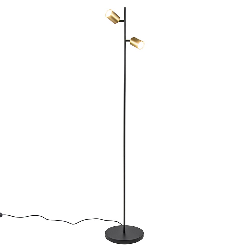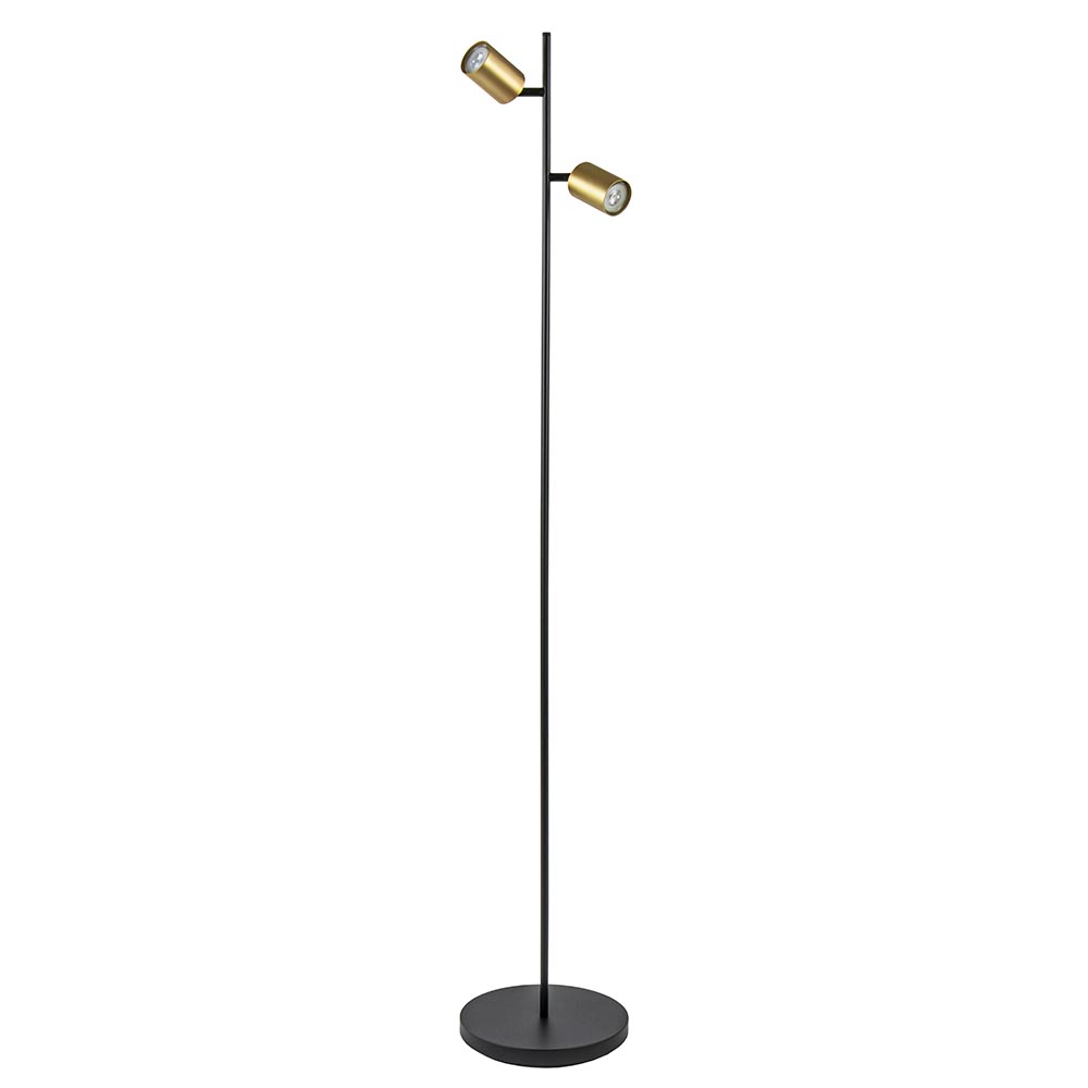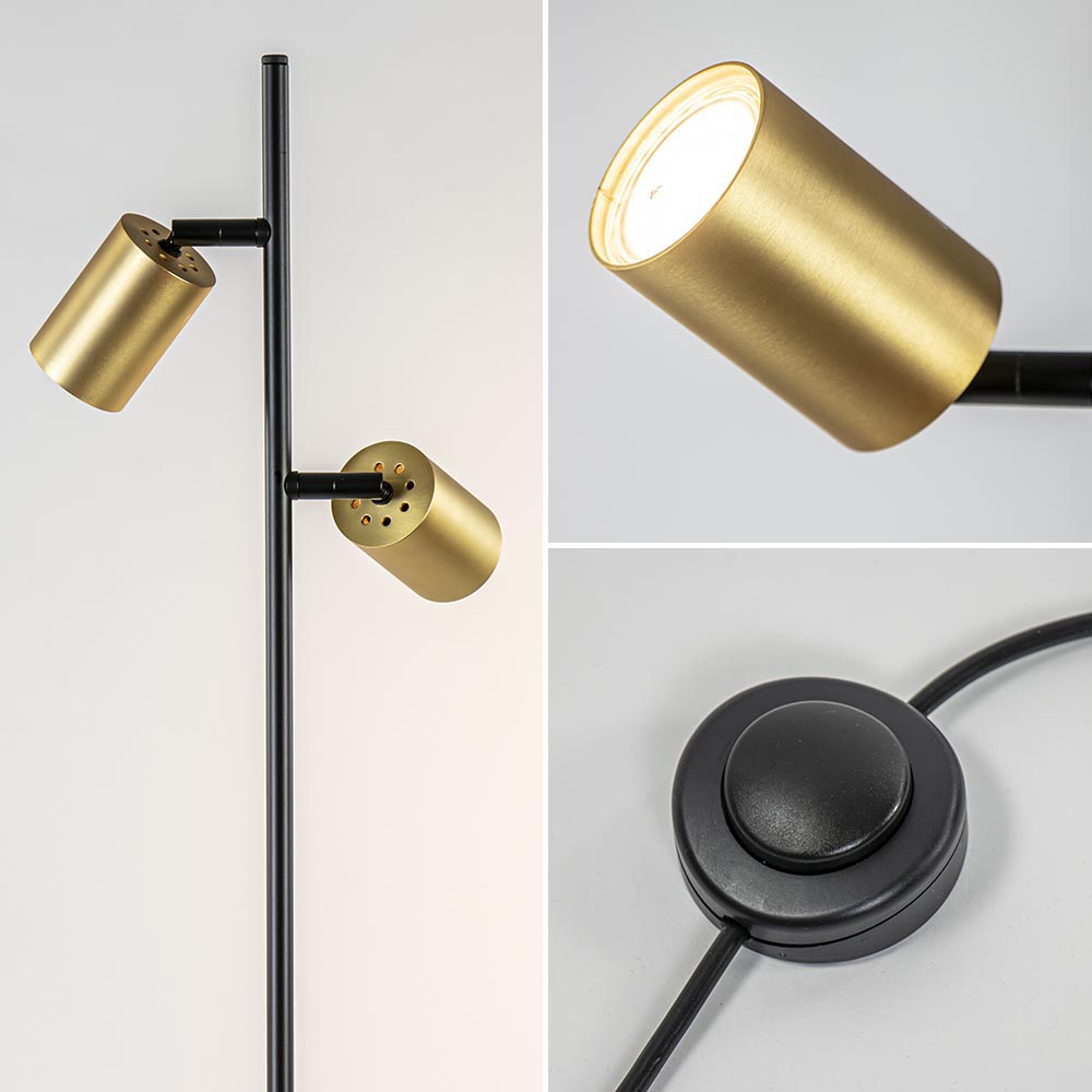 Deze stijlvolle vloerlamp is een ideale toevoeging voor de woon- of slaapkamer. De 2-lichts vloerlamp heeft een slank armatuur dat is voorzien van een mat zwarte finish. De metalen spots zijn uitgevoerd in het goud en zijn naar wens te verstellen door deze te draaien en of te kantelen. De combinatie van het zwart en goud maakt de vloerlamp prima geschikt voor diverse woonstijlen, van klassiek tot trendy. De vloerlamp met spots heeft een hoogte van 153 cm en is voorzien van een zwart snoer van 250 cm. De voetschakelaar bevindt zich op 105 cm in het snoer. De mat zwarte staande lamp met gouden spots wordt geleverd zonder lichtbron (2x GU10).