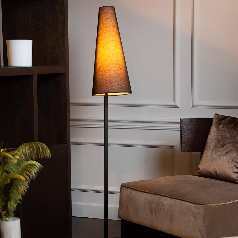 – Afmeting: 24 x 24 x 140 cm – Voet: 24 x 24 x 1 cm – Kap: Ø23 x 49,5 cm – Metaal, mat zwart – linnen, zwart – Exclusief lichtbron (E27) – Dimbaar (exclusief)