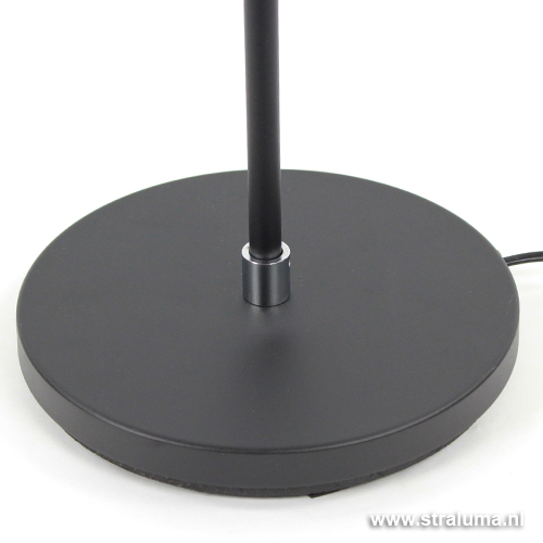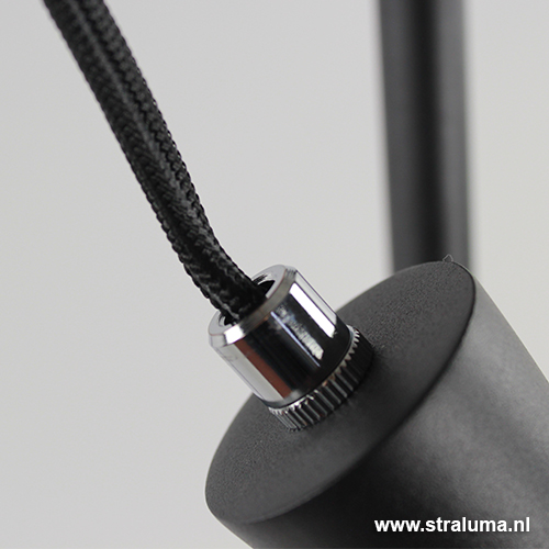 De spot zijn in hoogte verstelbaar langs de bovenste 35 cm van de poot. de spot is aan de lamp verbonden met een zwart strijkijzersnoer.