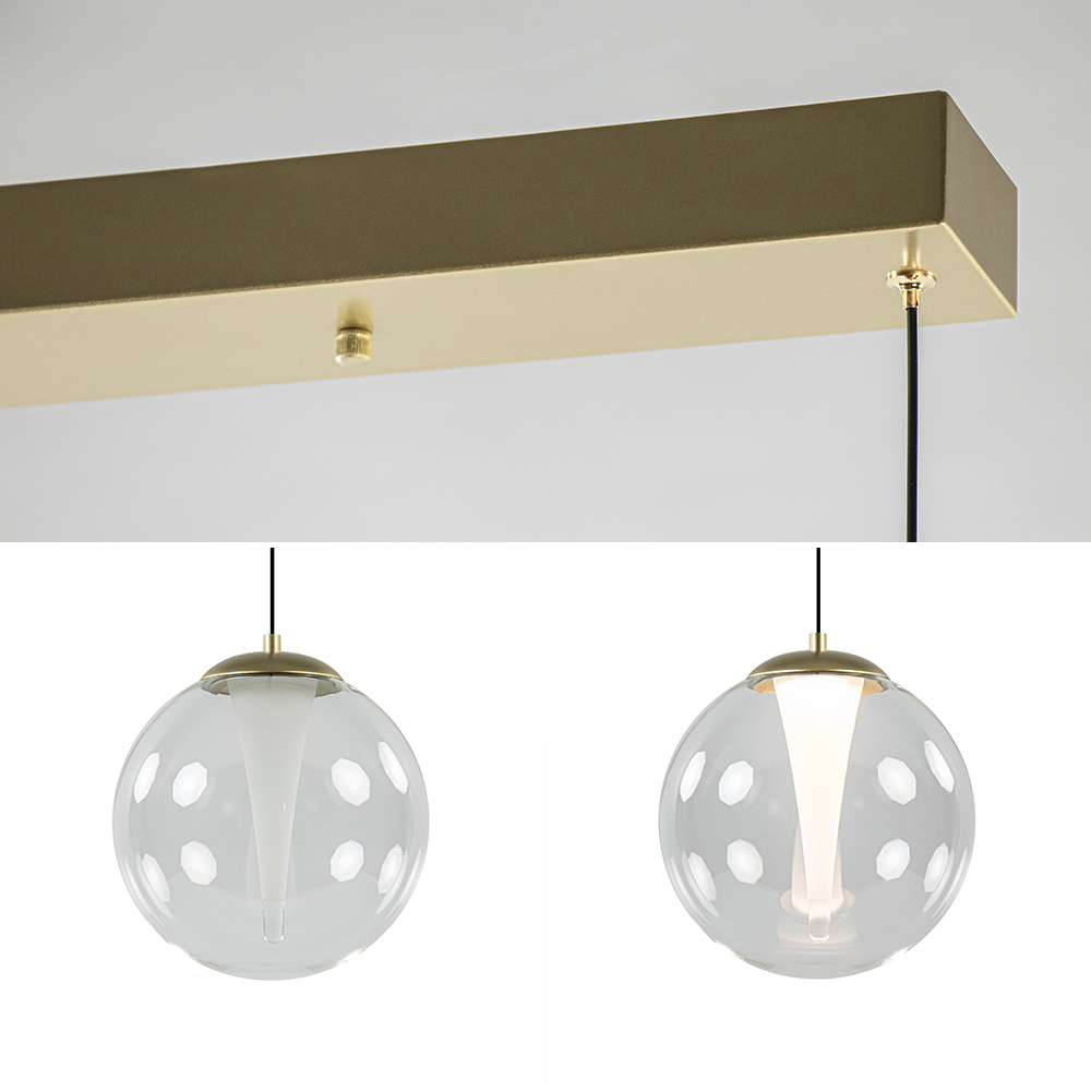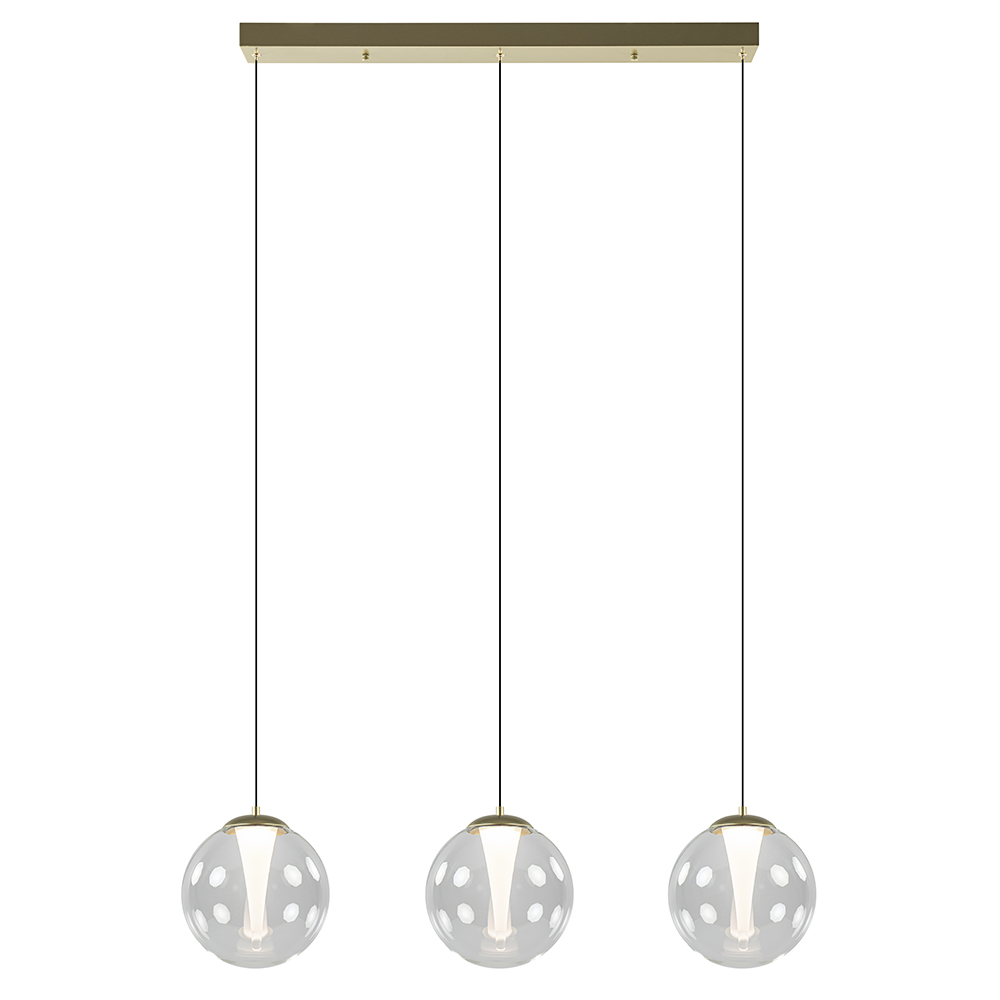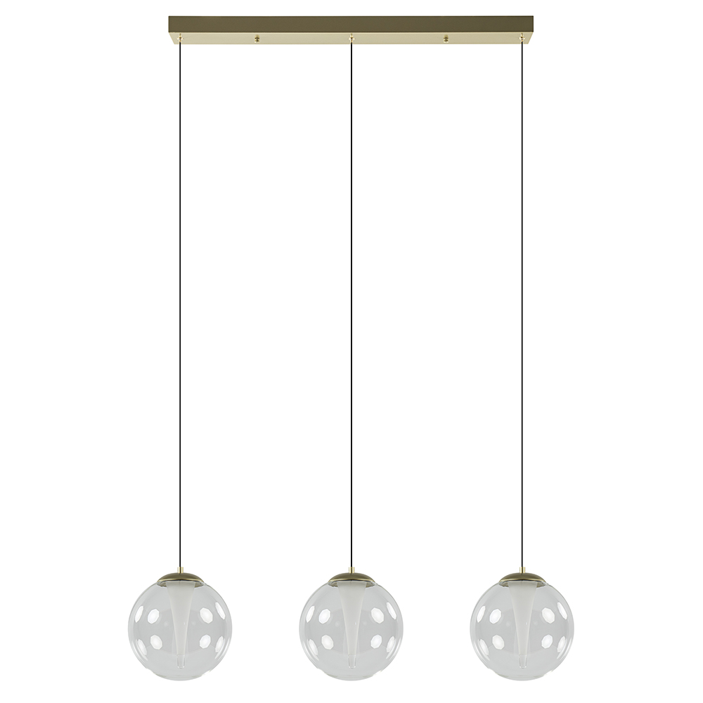 Deze stijlvolle hanglamp maakt de eetkamer helemaal af. De 3-lichts hanglamp heeft een gouden armatuur dat is gecombineerd met helder glas. In de helder glazen bollen is ook nog een mat binnenglas toegepast welke oplicht wanneer de lamp wordt ingeschakeld. Dit geeft een mooi en chic effect dat de lamp helemaal eigen maakt. De glazen bollen hangen aan zwarte snoeren die naar wens zijn in te korten. De maximale hoogte van de eetkamerhanglamp is 150 cm. De gouden hanglamp is voorzien van geïntegreerd LED en is dimbaar middels een externe dimmer (exclusief).