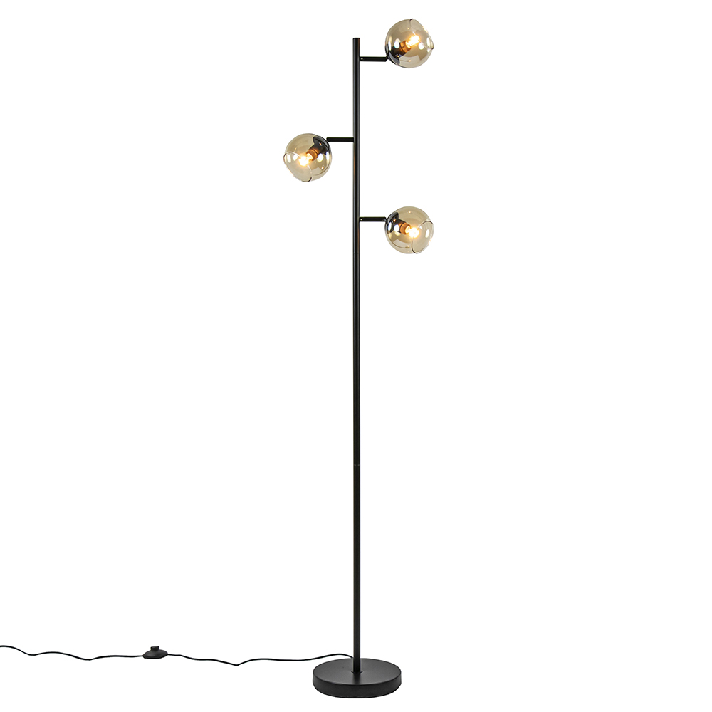 / Lampen / Vloerlampen / Stijlvolle vloerlamp zwart met amber glas 3-lichts Ø12cm