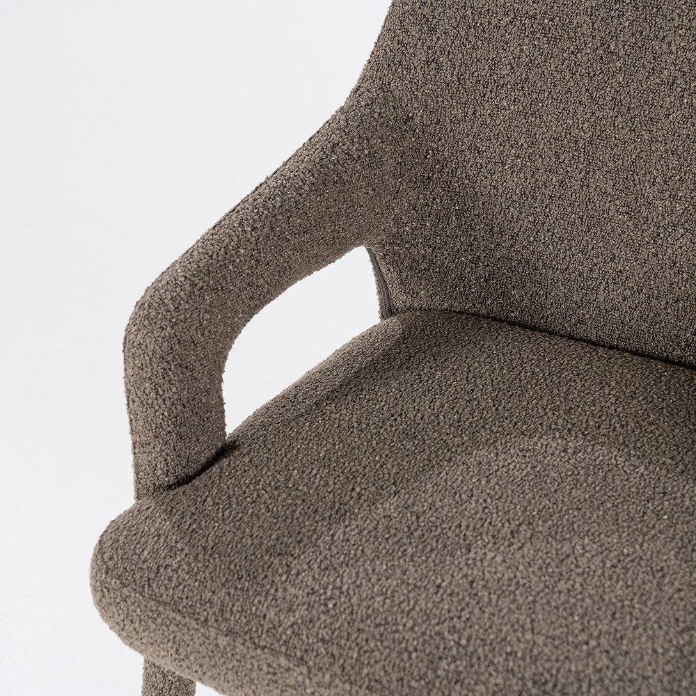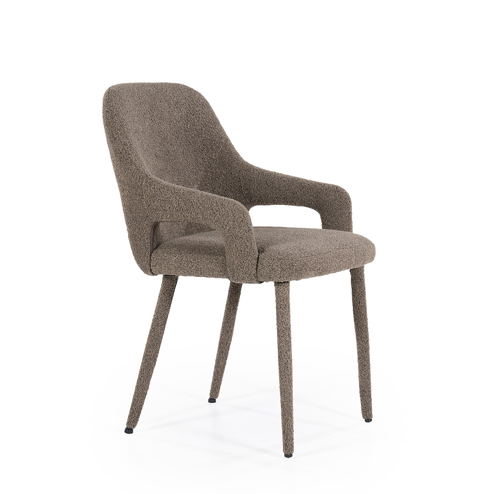 Comfortabele eetkamerstoel met armleuningen, bekleed met zachte bouclé stof in warme bruintint. De meegestoffeerde poten zorgen voor een extra verfijnde en warme uitstraling.