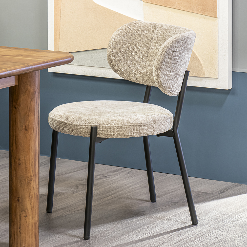 Productomschrijving De By-Boo “Oasis” stoel is ontworpen met oog voor comfort én stijl. De zitting en rugleuning zijn royaal bekleed met een zachte, gemêleerde taupekleurige stof die uitnodigt tot lange tafelmomenten. Dankzij het slanke, zwarte metalen frame oogt de stoel luchtig, terwijl de subtiel afgeronde vormen zorgen voor een zachte, toegankelijke uitstraling. De Oasis past naadloos in zowel moderne als rustieke woonstijlen en laat zich makkelijk combineren met hout, natuursteen of andere natuurlijke materialen. Ideaal als eetkamerstoel, maar ook perfect in een werk- of leeshoek.