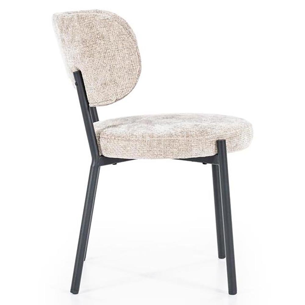 Een stijlvolle, comfortabele eetkamerstoel met een zachte taupe bekleding en een strak zwart metalen frame – perfect voor zowel moderne als natuurlijke interieurs.