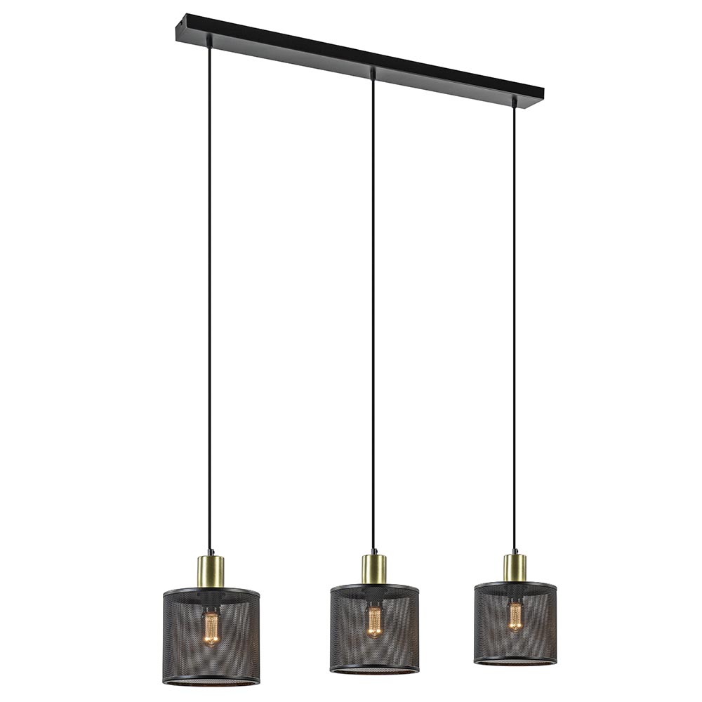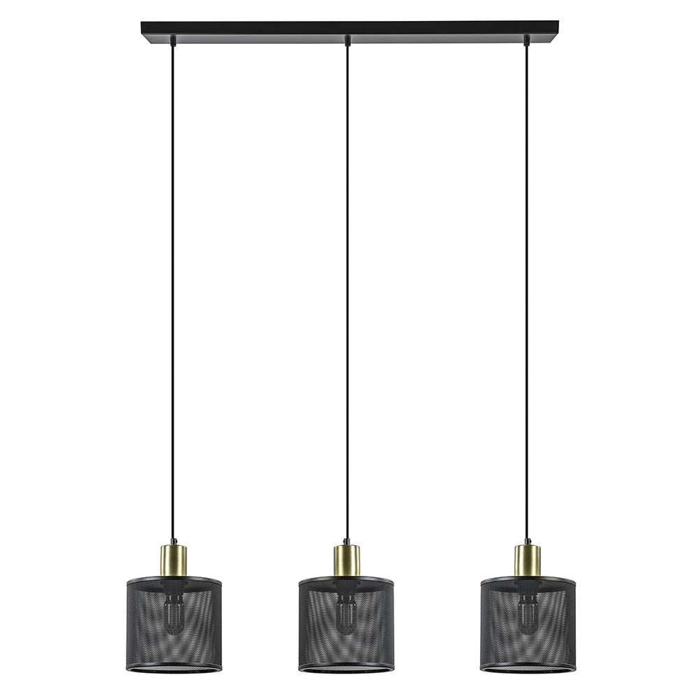 Een stoere 3-lichts hanglamp met een industriële / Scandinavische look. De hanglamp is perfect voor boven een eettafel, bartafel of kookeiland. De hanglamp is voorzien van metalen cilindervormige kappen die zijn uitgevoerd in mat zwart. Dit past mooi bij de zwarte snoeren en de mat zwarte bevestiging. Leuk detail aan de kappen zijn de gouden fittingen. Doordat de kappen van gaas zijn gemaakt zijn ze open van structuur en kan er een goede lichtverspreiding plaatsvinden. Een decoratieve lichtbron is dan ook een mooie optie voor deze eettafelhanglamp. De kappen zijn gemakkelijk naar wens op hoogte te hangen, de maximale hoogte van de lamp is 150 cm. De mat zwarte hanglamp met goud wordt geleverd zonder lichtbron en is dimbaar middels een externe dimmer (exclusief).