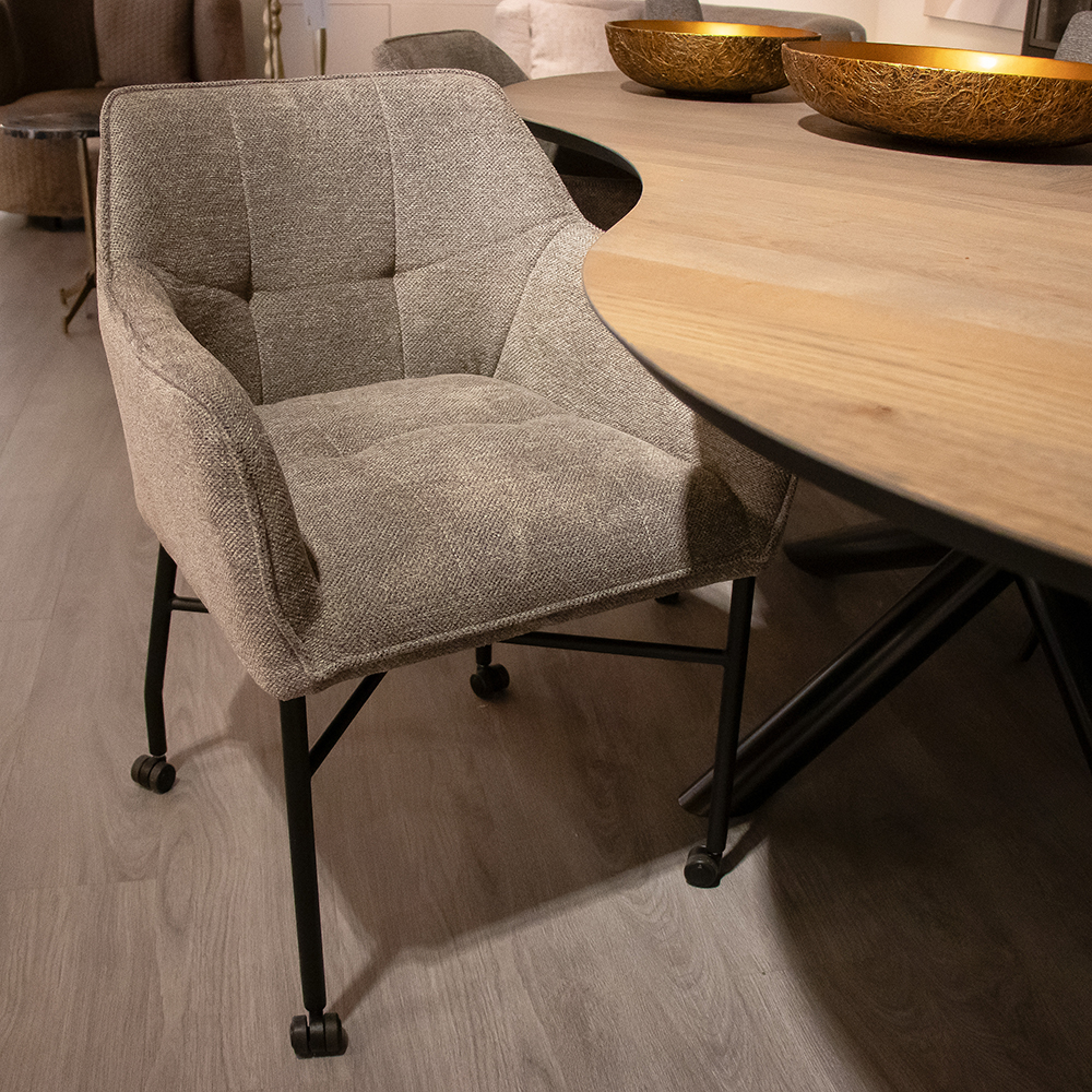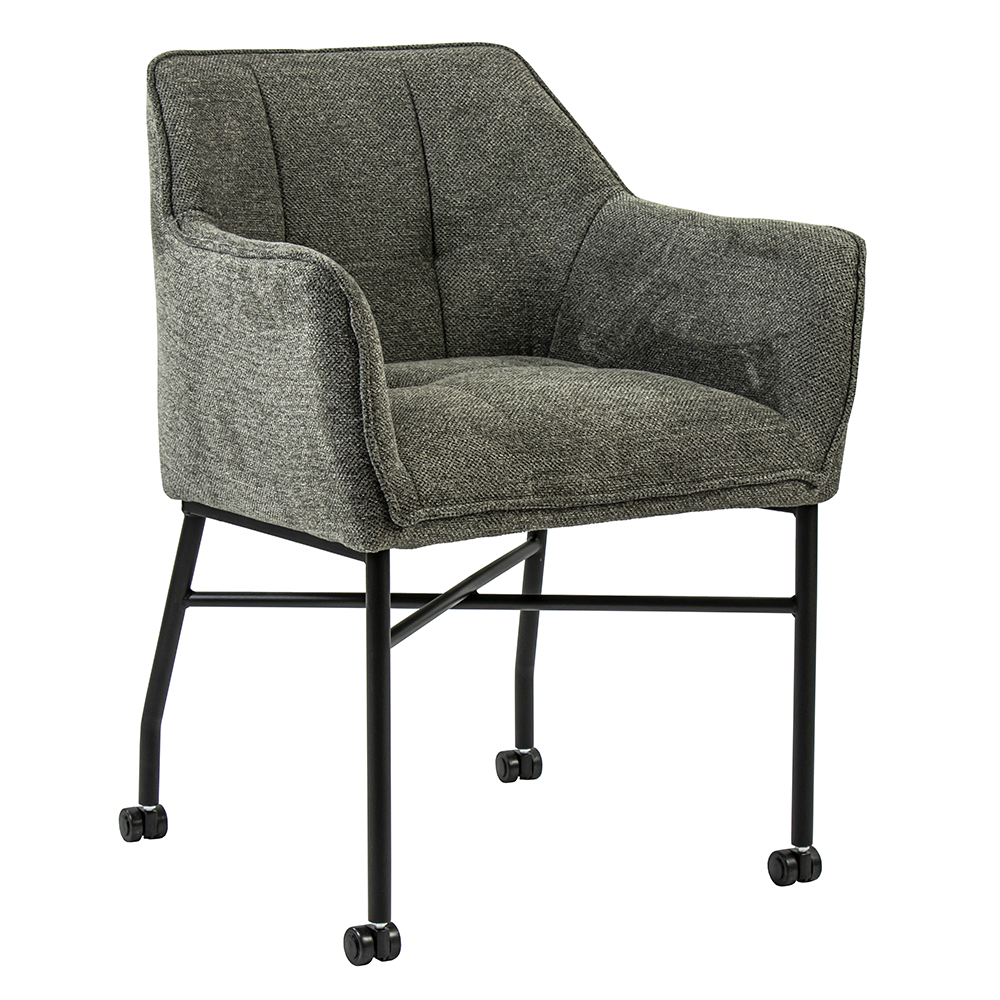 Een heerlijke comfotabele eetkamerstoel op wieltjes. De armstoel maakt dineren nog fijner en zorgt dat aanschuiven nog gemakkelijker gaat dankzij de wieltjes. De eetkamerstoel heeft een zachte stoffen zitting met een grove strcutuur en is uitgevoerd in het grijs. Het frame dat de zitting ondersteund is van metaal en voorzien van een mat zwart finish.