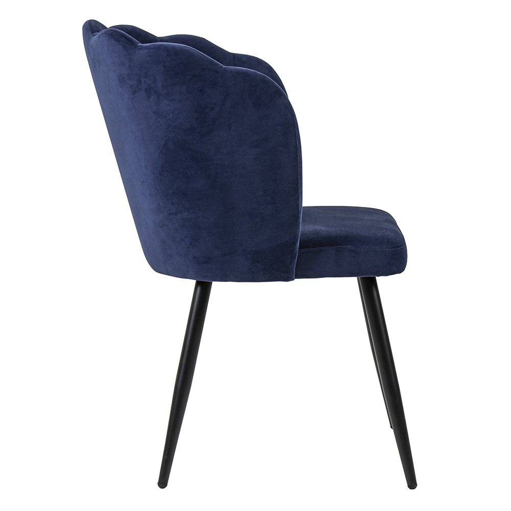Een trendy eetkamerstoel die helemaal past bij de huidige trends. Van luxury tot chique, deze stoel past bij allemaal. De eettafelstoel heeft een stoffen zitting die is uitgevoerd in het blauw. De slanke pootjes zijn van metaal en voorzien van een zwarte coating. De rugleuning loopt iets verder door aan de zijkant wat een goede ondersteuning biedt. Een fijne stoel om lekker op te dineren of borrelen.