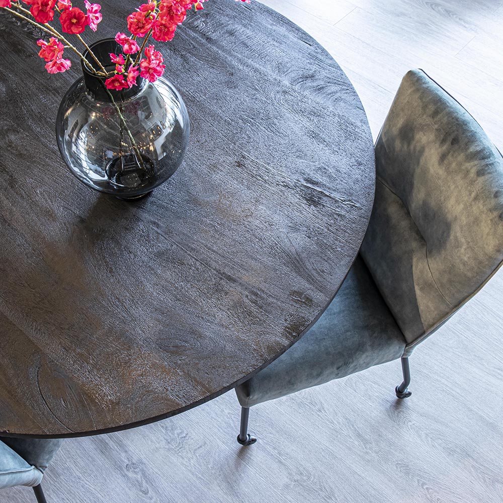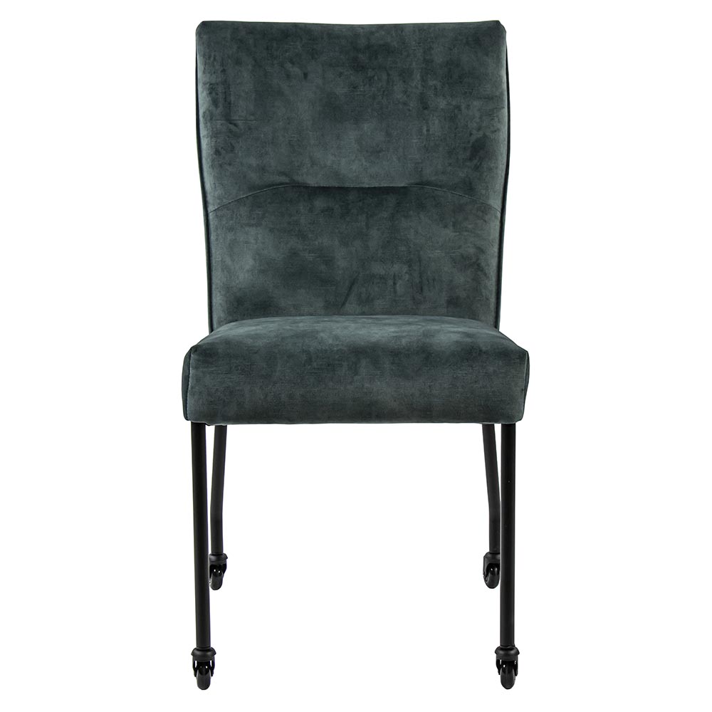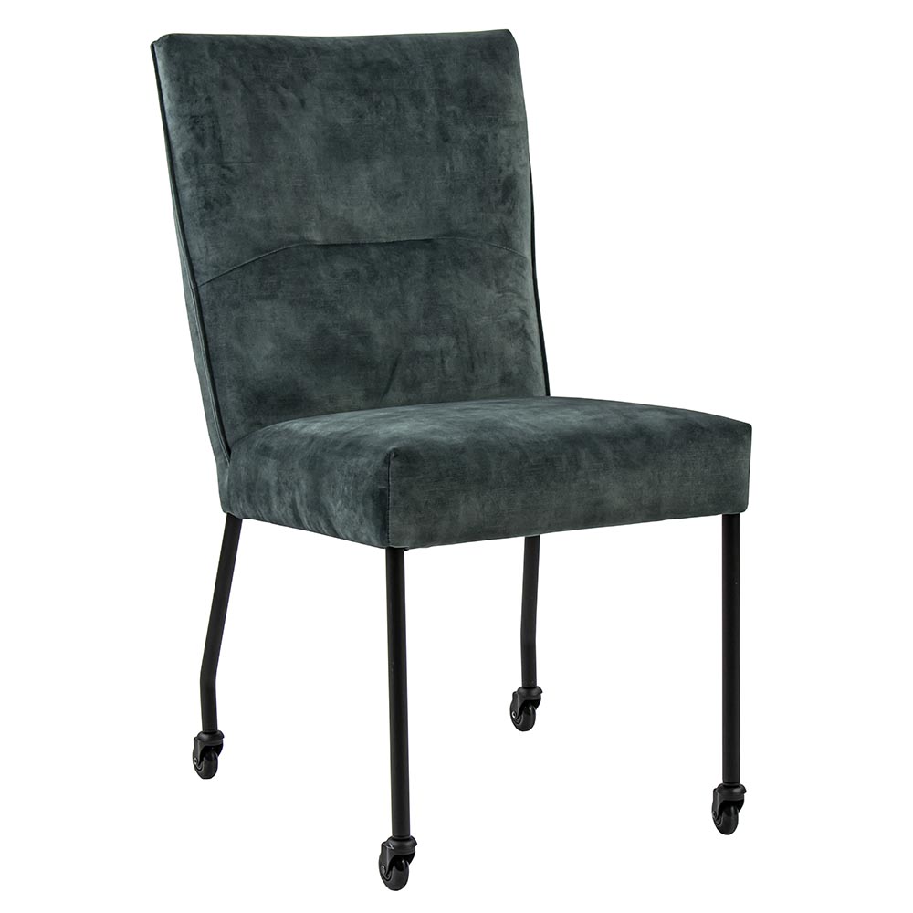 Een fijne eetkamerstoel met een heerlijk zitcomfort. De stoel is voorzien van een stoffen zitting die is uitgevoerd in het blauw/grijs velours. Dit geeft de eetkamerstoel een trendy en chique look. De stoel heeft slanke mat zwarte pootjes die zijn voorzien van wieltjes voor extra comfort.